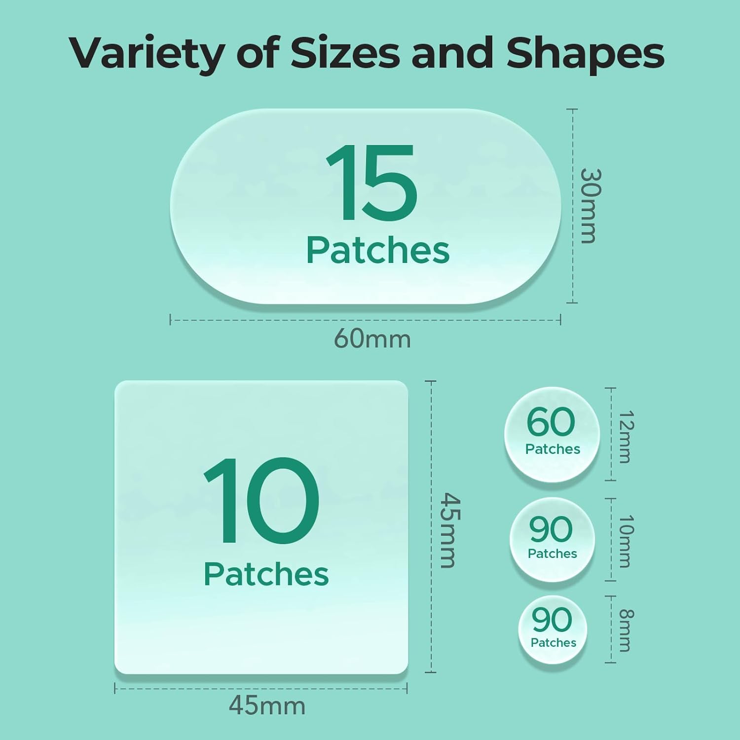 - 5 Sizes with 265 Patches: Our set offers a range of patch sizes to suit your needs: 60x30 mm XL strips, 45x45mm large patches and 8mm, 10mm, 12mm acne dots. Whether you're targeting breakouts on your back, face, chin or forehead, you'll find the ideal hydrocolloid patch to fit and address each area effectively