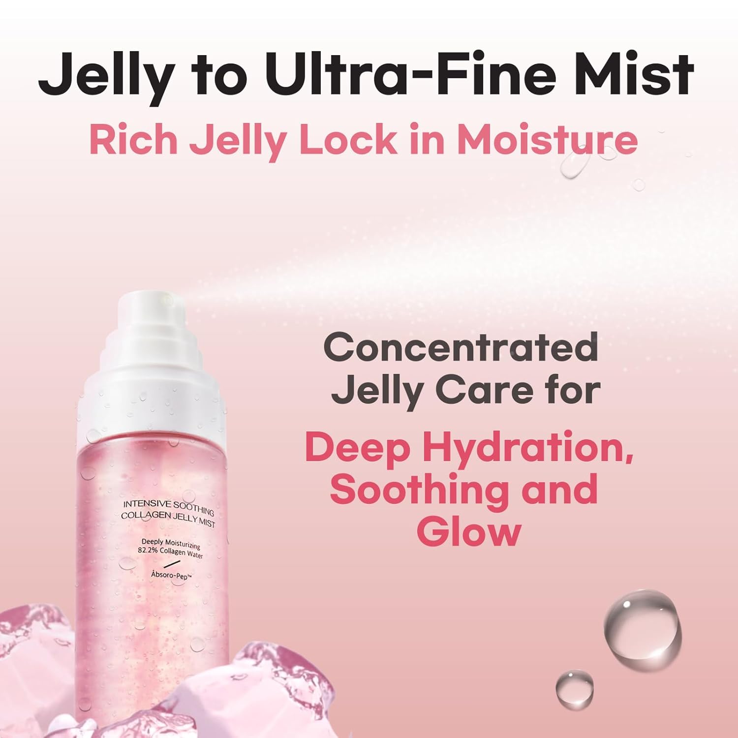 - Dewy & Glow : Formulated with 82.2% Vegan Collagen Water and 16 types of Hyaluronic Acids, this hydraing pink mist transforms from a jelly to a ultra-fine mist texture, delivering a more abundant dose of moisture. Aurtier pink jelly mist instantly soothes dry, tired skin while restoring elasticity, plumping and radiance without any heaviness.
