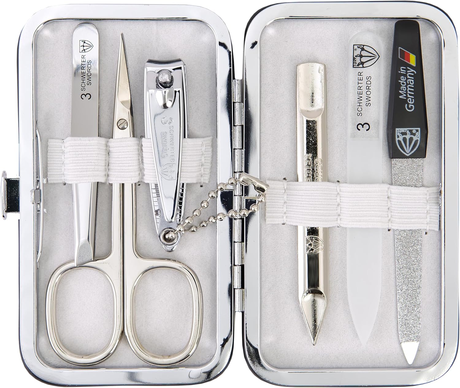 3 Swords Germany - Brand Quality 6 Piece Manicure Pedicure Grooming kit Set - Scissors, Metal and Glass Nail File, Clipper, Tweezers with Synthetic Leather case - White