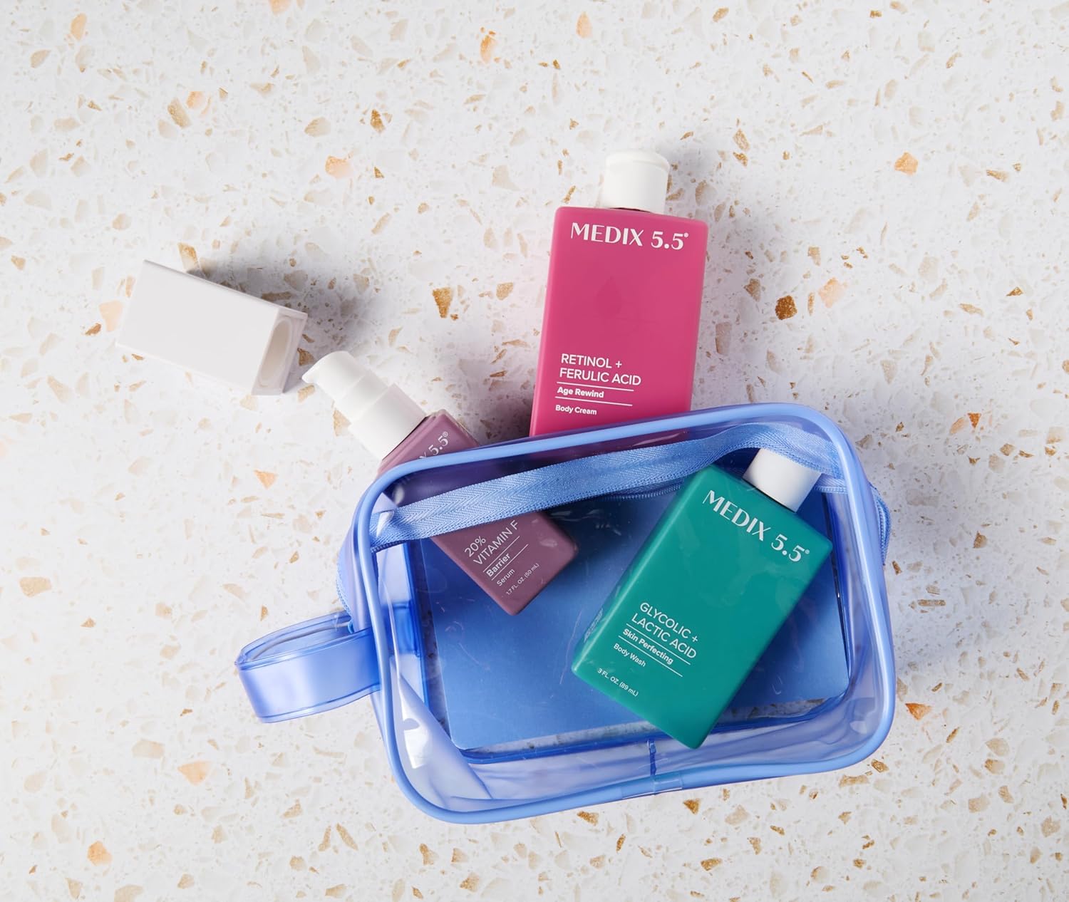 MEDIX 5.5 Best Sellers Travel Kit Skin Care Set - Retinol Body Lotion + Glycolic Acid Exfoliating Body Wash + 20% Vitamin F Body Oil 3PC Skincare Set | Crepey Skin Care Treatment, 3 Piece Travel Kit