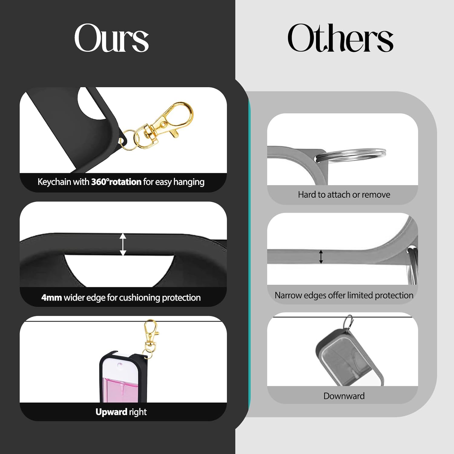 - 360° Rotating Keychain for Convenience: Equipped with a keychain featuring 360° rotation, the case can be easily attached to bags, keys, or belts for effortless portability, keeping your hand sanitizer always within reach.