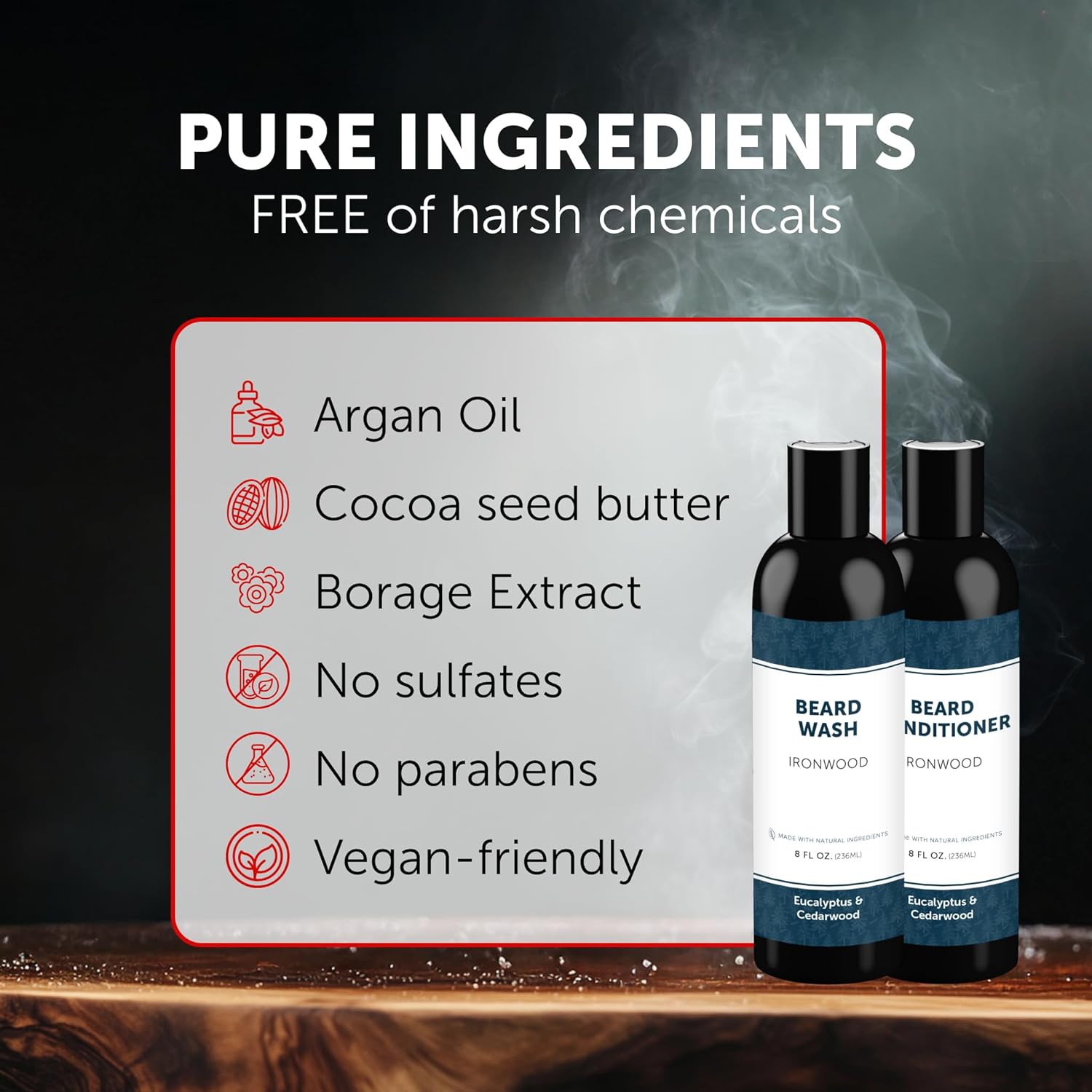 Detroit Grooming Co. Beard Wash & Conditioner Bundle – The Ultimate Beard Kit with Biotin & Argan Oil – Fresh Cherry Tobacco Scent – 8 oz Each (Ironwood)