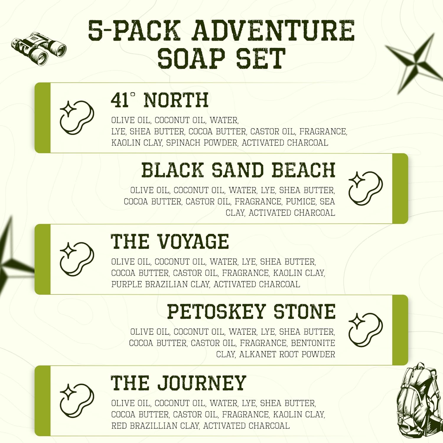 - SCENT VARIETY: Elevate your grooming with a mix of bold scents in our variety pack, featuring 41° North, Black Sand Beach, The Voyage, Petoskey Stone & The Journey. This mens body soap bar set is a perfect addition to your daily routine.