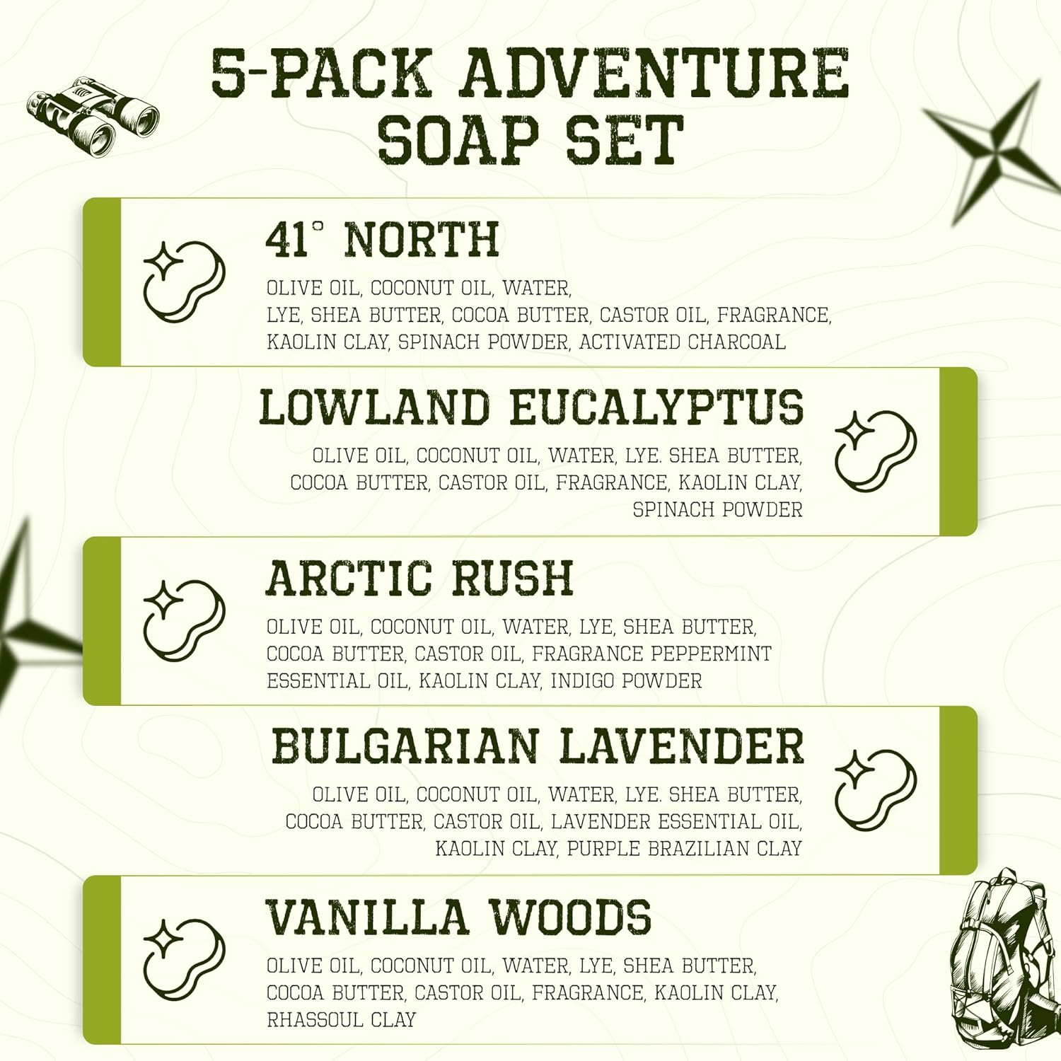 - SCENT VARIETY: Elevate your grooming with a mix of bold scents in our variety pack, featuring 41° North, Lowland Eucalyptus, Arctic Rush, Bulgaian Lavender & Vanilla Woods. This women and mens body soap bar set is a perfect addition to your daily routine.