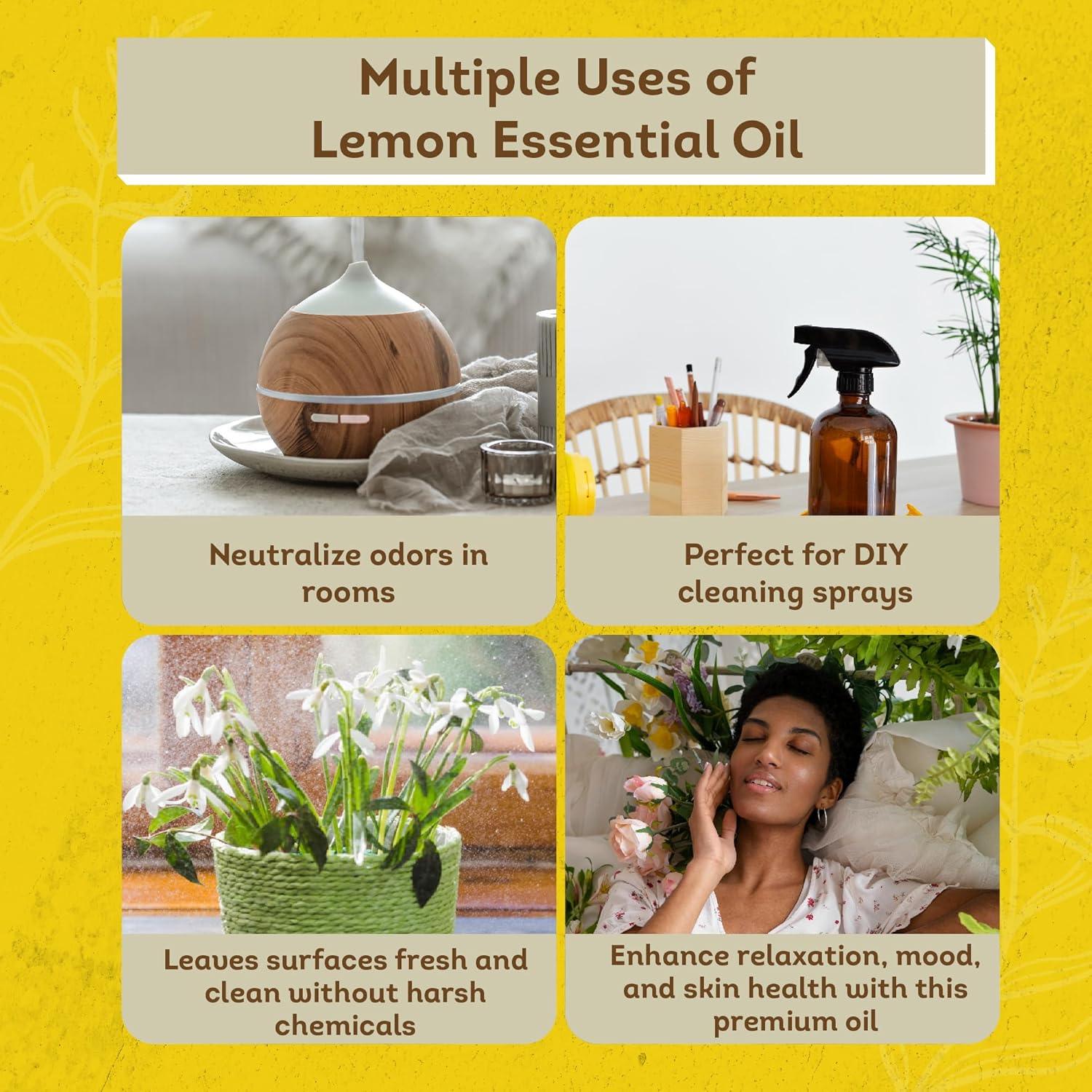 - Refreshing & Uplifting Aroma: Enjoy the fresh citrus scent of 100% pure Lemon essential oil. Known for its deodorizing properties, it elevates the mood in any room. Great for use in aromatherapy diffusers.