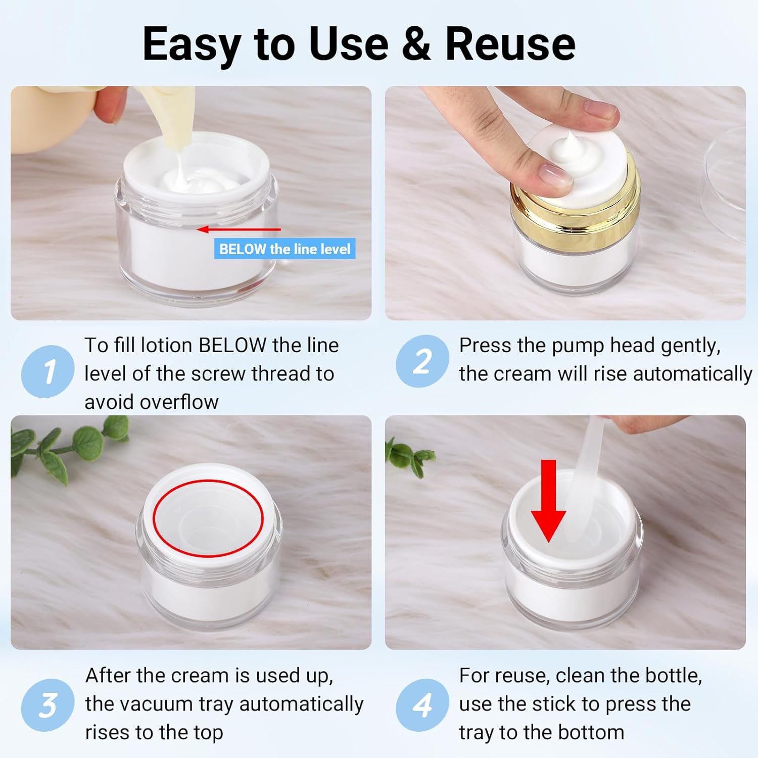 - Innovative Airless Pump Mechanism: Leveraging advanced vacuum technology, our airless pump bottles can protect cosmetics against exposure to air, prolonging the product's freshness. To fill lotion BELOW the line level of the screw thread to avoid overflow