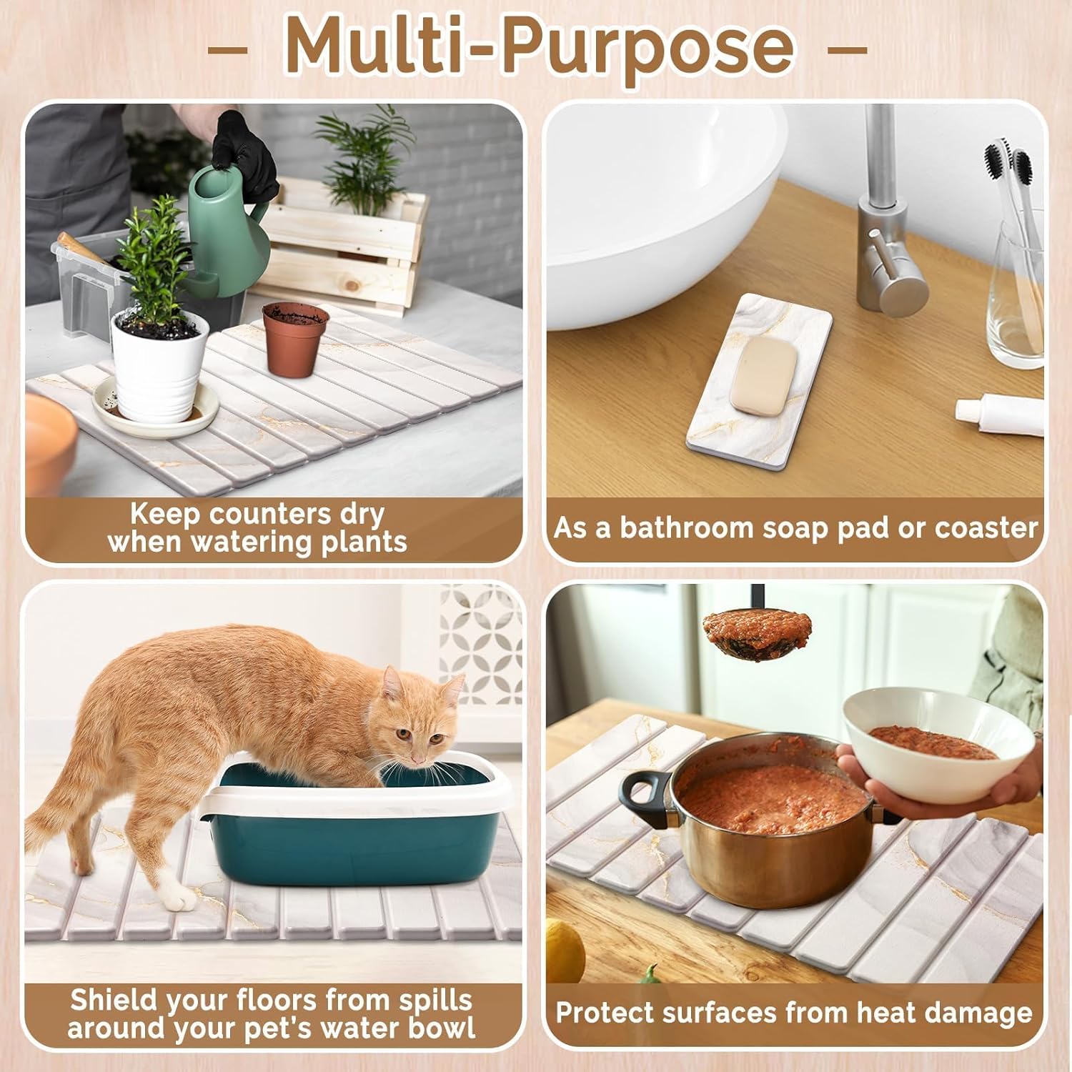 - 【Wide application】Collapsible stone dish drying mat helps maintain a clean kitchen, ensuring your surfaces stay neat and fresh. The large stone drying mat acts also as a heat-resistant mat, protecting countertops from hot pots and pans. kitchen drying mat also doubles as a bath mat, plant saucer, or pet feeding mat, offering flexibility for various home uses.