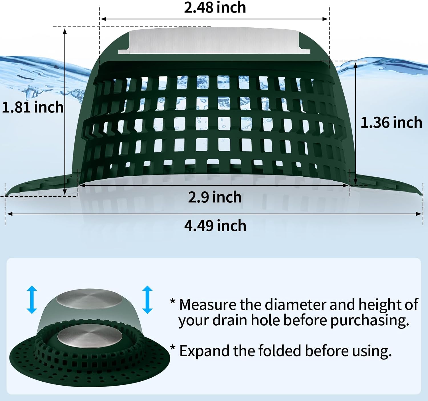 - Shower Drain Hair Catcher - Tall & dome design fits both flat and pop-up drains. Its outer diameter measures 4.49", inner diameter 2.9", inner height measures 1.36", fits most US standard drains.