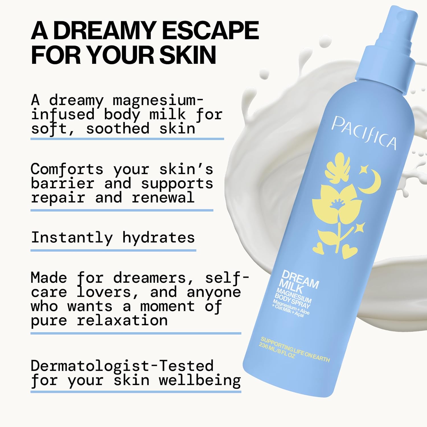 - MAGNESIUM BODY SPRAY FOR RELAXATION – Pacifica Dream Milk Magnesium Spray is your nightly ritual for instant relaxation and calm. Infused with soothing magnesium oil and calming essential oils like lavender and chamomile, it helps ease tension, promotes restful sleep, and provides stress relief. This topical magnesium spray is perfect for winding down after long days, soothing tired muscles, and promoting restful, peaceful sleep. Experience the relaxing benefits of magnesium and calming aromatherapy.