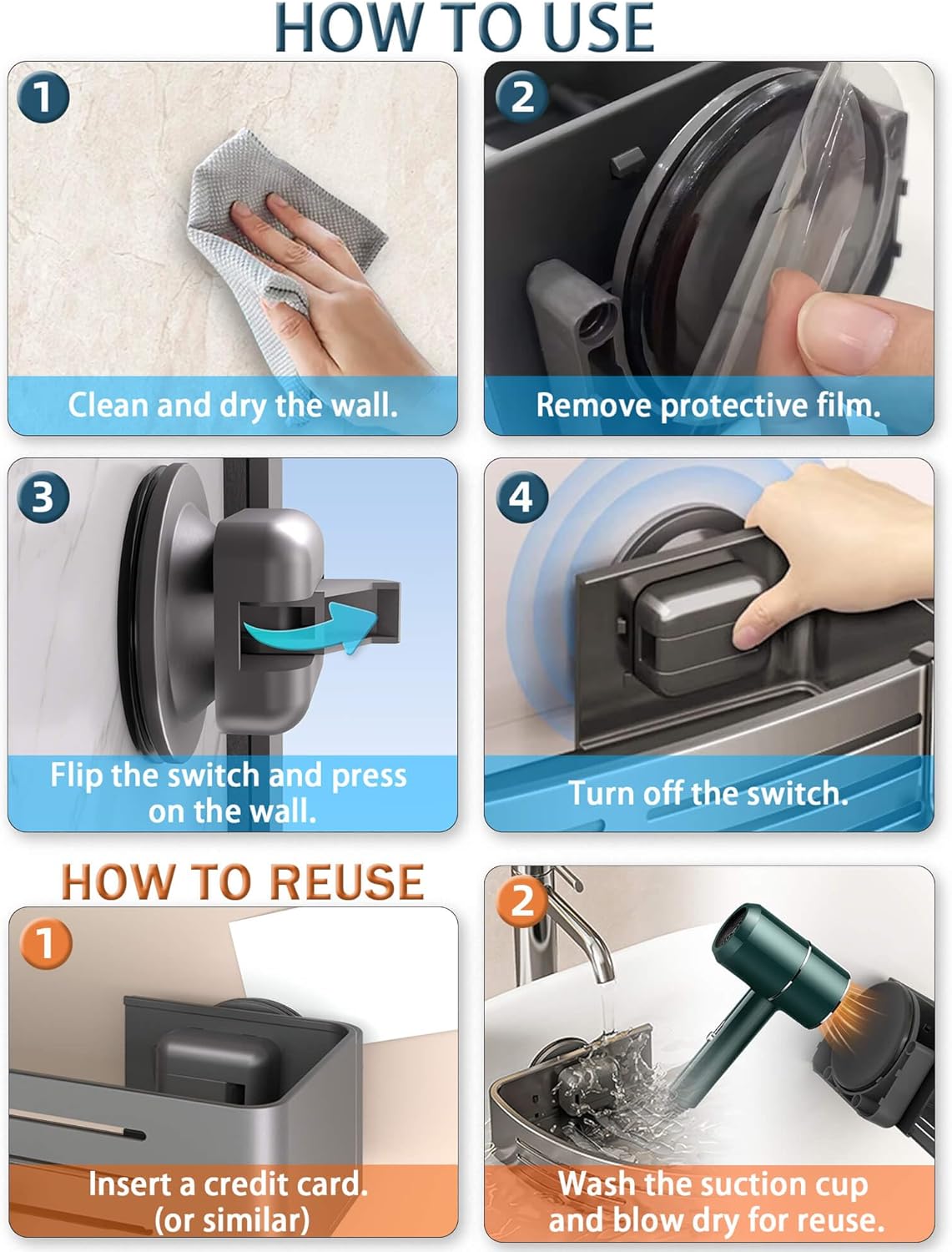 - One-Second Installation: This Corner shower caddy suction cup requires no drilling, screws, holes, or glue, making installation quick and hassle-free. Attach it to smooth, clean, dry, flat, and non-porous surfaces. Remove the protective film, open the buckle, press firmly against the wall, and close the buckle to ensure a secure hold. Note: Make sure the wall has no water stains and dirt before installation to ensure the best possible adhesion