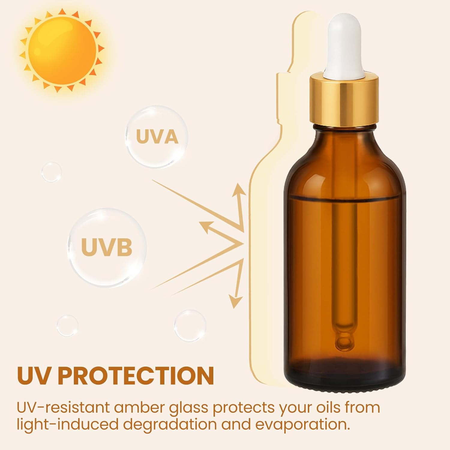 - UV Protection for Preserving Contents: UPBUD eye dropper bottle crafted from amber glass, these dropper bottles offer effective UV resistance, safeguarding your oils and other light-sensitive liquids from rapid degradation and evaporation.