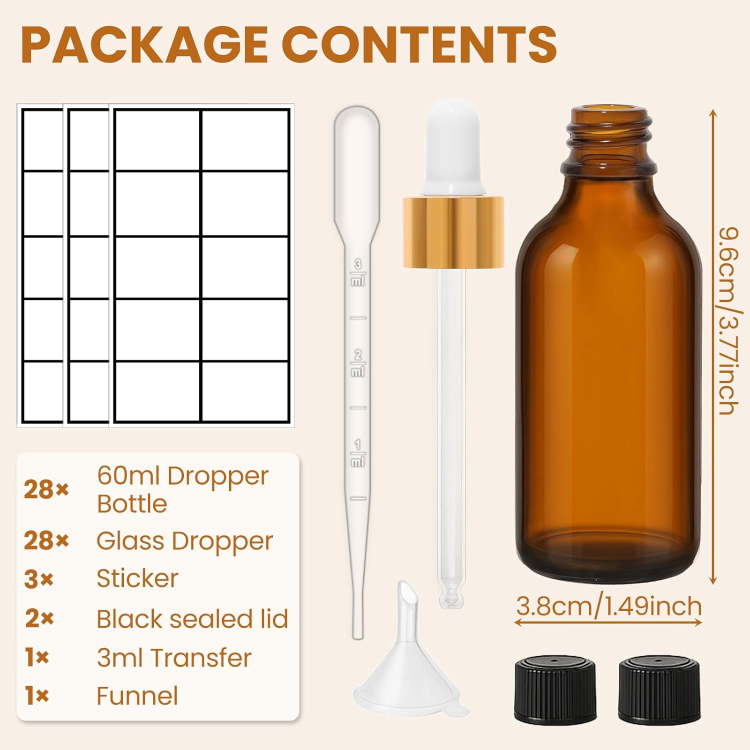 - Comprehensive Set for Versatile Use: This set includes 28 pieces of 2oz amber glass dropper bottles, label stickers for easy organization, 1 funnel, 1 3ml dropper, and 2 extra black caps — perfect for storing and dispensing essential oils, perfumes, beard oils, hair oils, and more.