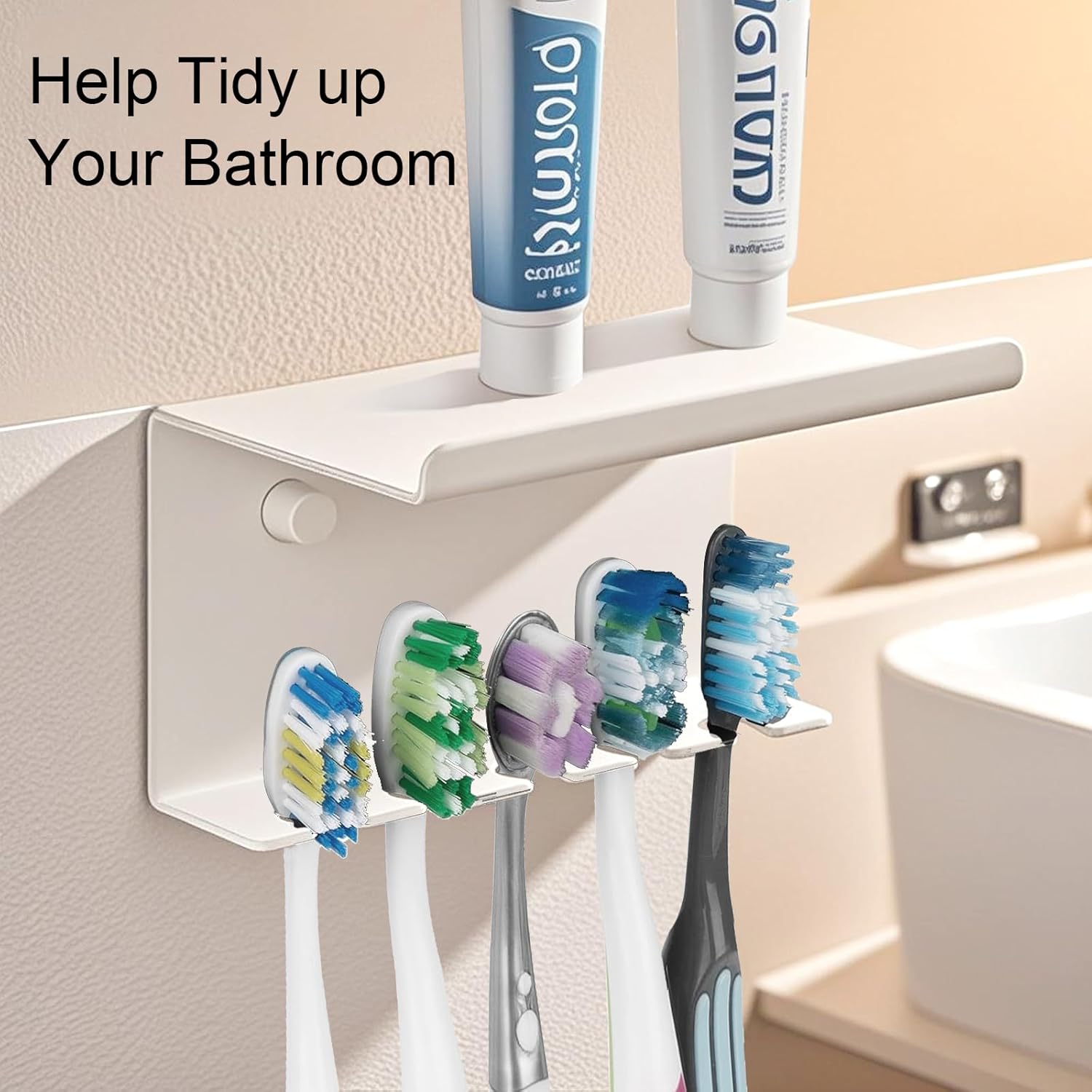 Wall Mounted Toothbrush Holder for Bathroom Shower, 5 Slots Aluminum Self-Adhesive Tooth Brush, Toothpaste Organizer Hanger Compatible with Colgate Extra Clean, Oral-B CrossAction, etc (White)