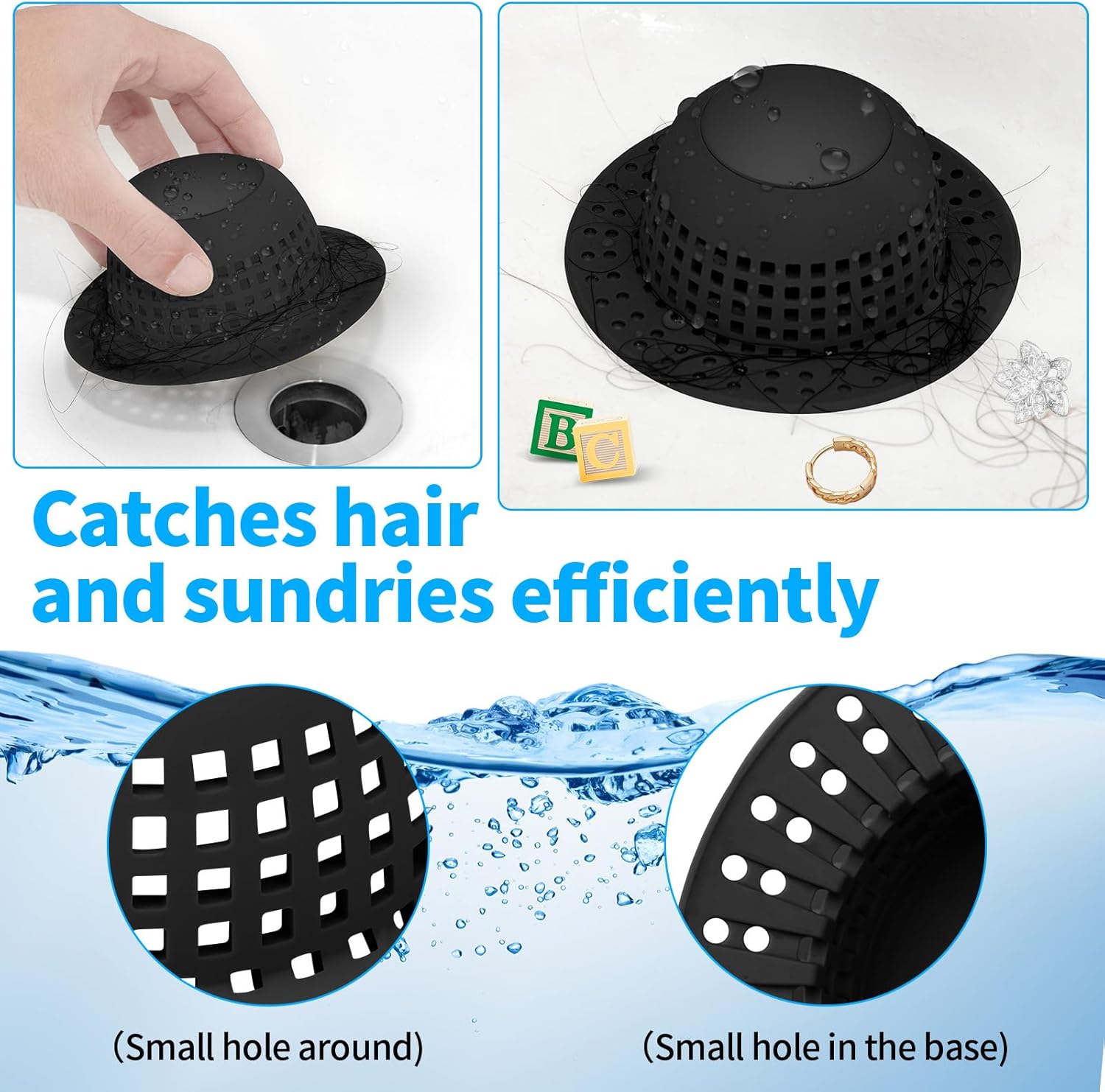 - Bathtub Drain Hair Catcher - Efficiently catches hair, rings, earrings while allowing water to drain and easy to use & clean.