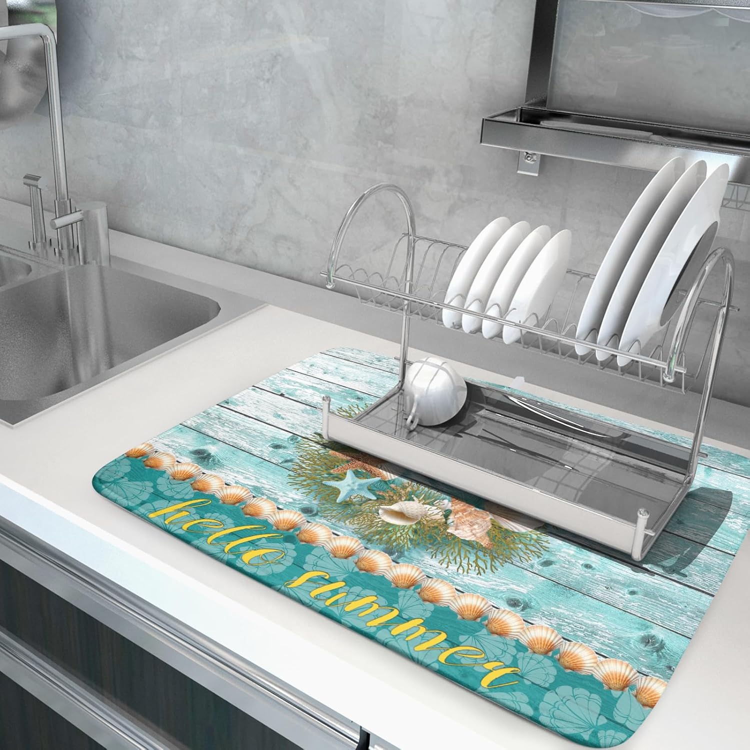 - 【Wide Usage】The dish drying mat designed with beach conch pattern, it is beautiful, soft, and durable. Not only a dish drying mat, cup mat, heat resistant mat, you can also use it as a kitchen countertop insulation mat. It is also a good choice to use it as a pet mat, picnic mat.