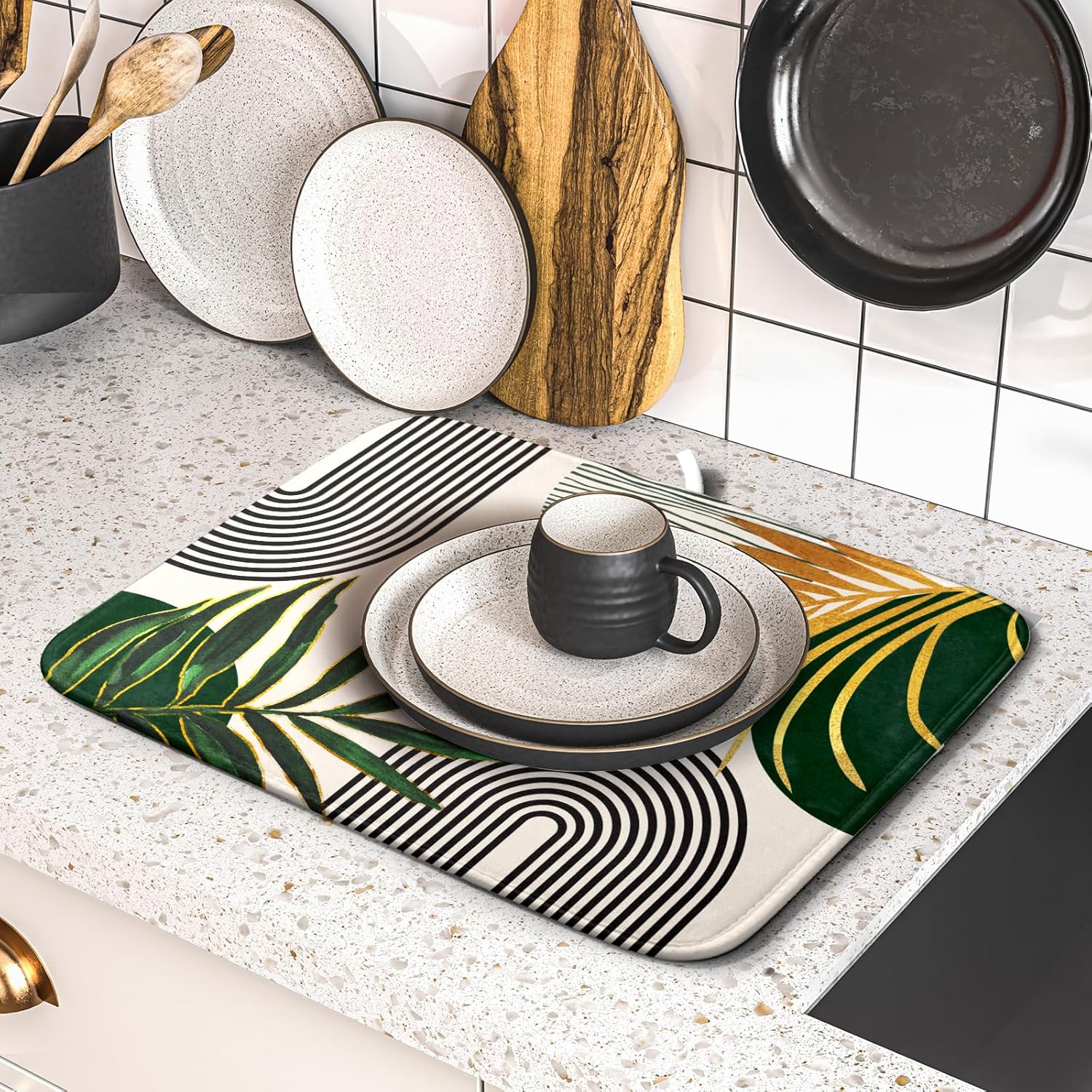 Boho Leaves Dish Drying Mat 16x18 inch Mid Century Absorbent Drainer Rack Mats Fast Dry Bottles Dish Dry Pad Protector Kitchen Accessories