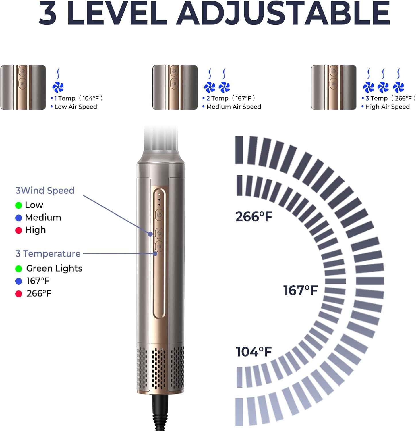 - 3 Temps & 3 Speed Settings Hair Dryer Brush:Hair dryer easy to use,the newly improved hair dryer is equipped with a 110,000 RPM high-speed brushless motor, strong airflow can dry hair in a short time, meet all hair style need➤ 1: Low Temperature, for dry hair / fine hair, Suitable for summer use. ➤ 2: Medium Temperature 75℃, for semi-dry hair / normal hair, Suitable for styling. ➤ 3: High Temperature 130℃, for wet hair / thick and curly hair, Suitable for winter use, dry hair quickly.