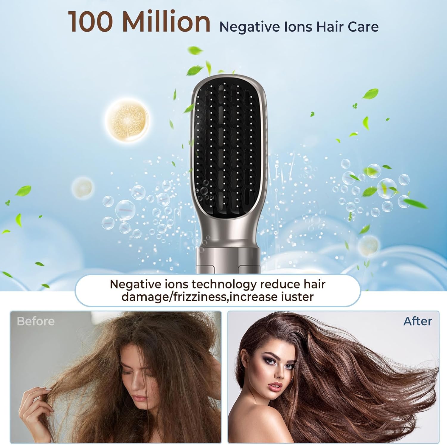 - 6 in 1 High Speed Blow Dryer Brush:Long press 2s Power button to turn on/off the hair dryer. 6 in 1 hair styler kit includes 1*high-speed ionic hair dryer, fast drying hair, 2*hair curlers to curl in different directions, curl set automatically Technology, 1*round brush smooths,and adds bounce, 1*Volumizer, reduces static and tangles, increases fluffiness,1*Massage hair straightener brush for straightening & smoothing. Explore styles for any hair type,saving your time and money.