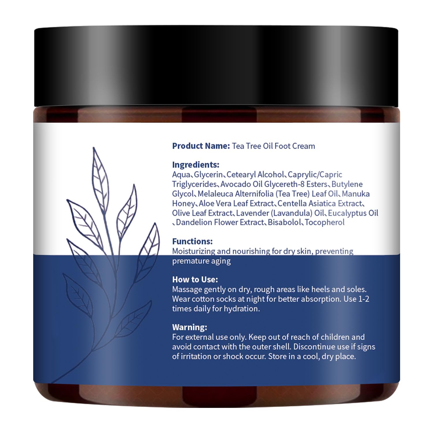 - Nourishing Natural Ingredients Our Tea Tree Oil Foot Cream is formulated with premium natural ingredients, including Tea Tree Oil, Aloe Vera Leaf Extract, Eucalyptus Oil, Manuka Honey, Dandelion Flower Extract, Olive Leaf Extract, Centella Asiatica Extract, and Lavender Oil. These ingredients work synergistically to provide deep hydration and nourishment to your feet.