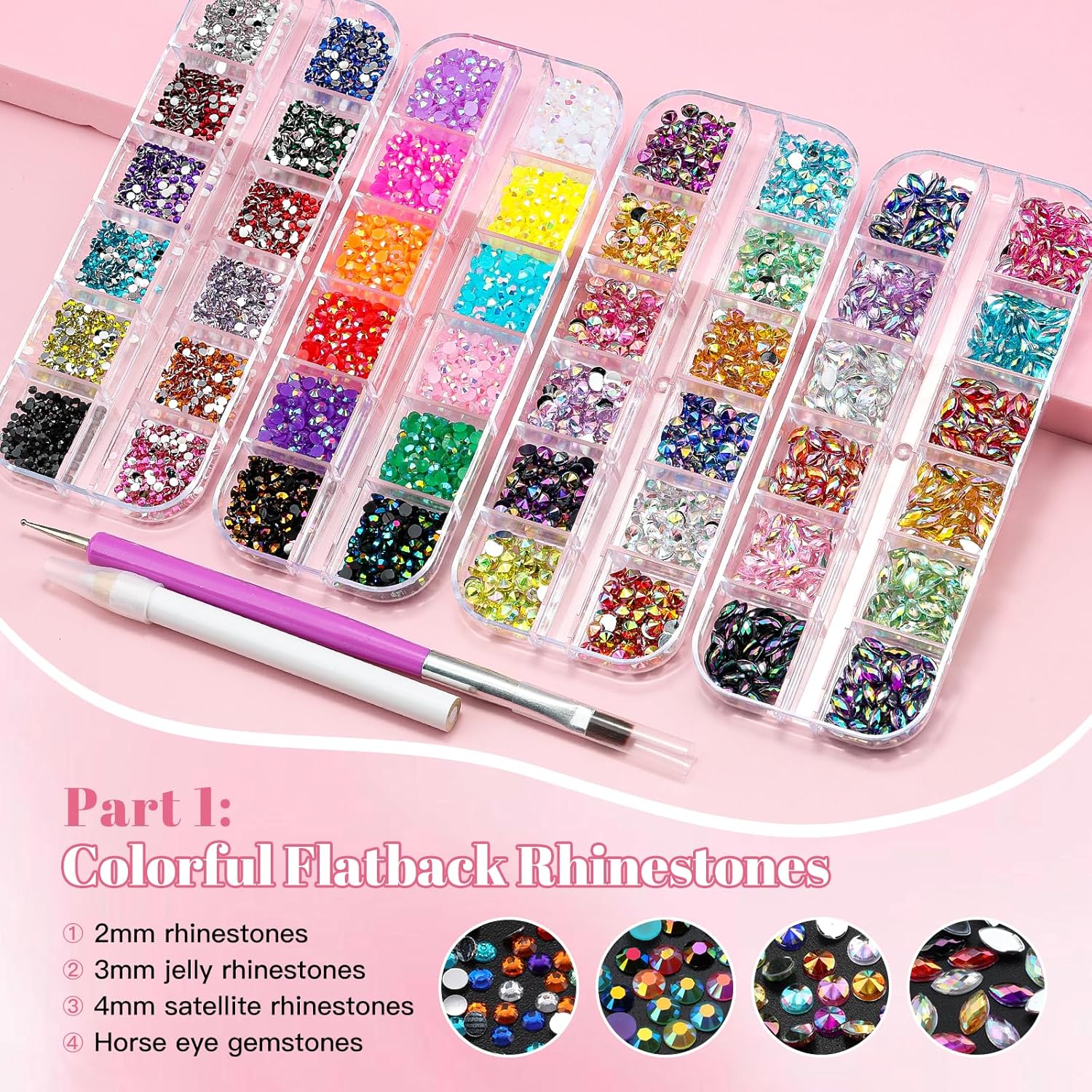 - 【Endless Nail Art Supplies Set】 You will get 1 box of 2mm crystal rhinestones, 1 box of 3mm jelly rhinestones, 1 box of 4mm satellite rhinestones, 1 box of iridescent 3x6mm horse eye gems, 1 box of white and beige pearls (2-6mm), 3 boxes of 3D gold/silver studs with 30+ shapes, 2 boxes of pink/white floral charms mixed with steel pearls, 1 box of holographic star sequins, 1 box of butterfly glitter sequins, plus 4 professional tools: dual-end dotting pens, wax pickup pen, and non-slip tweezer—all curated for salon-quality nail art, dazzling DIY crafts, and festive holiday designs.