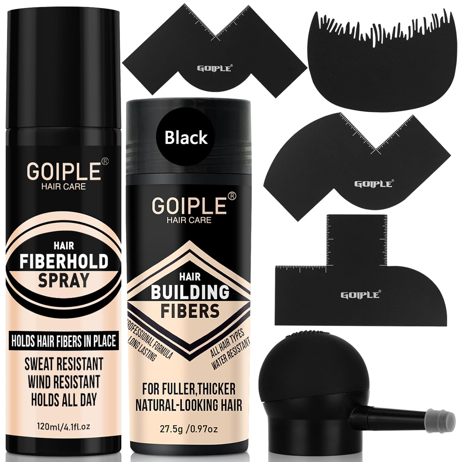 - Barber Approved All Day Grip: This 7 in 1 set pairs hair fiber spray kit with beard tools for head to chin mastery. Fibers flex naturally with hair movement yet resist transfer—survives hugs, helmets, and sudden downpours without smudging