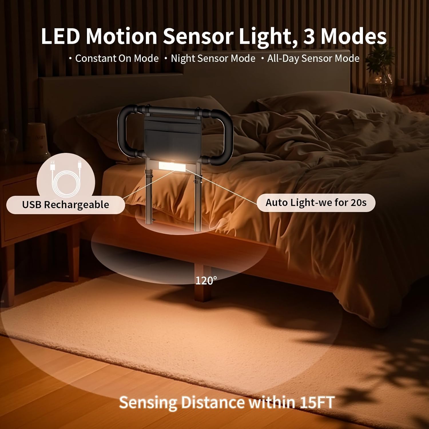 - Motion Sensor Light:The bed rail is equipped with a motion sensing light with three modes: constant light, night sensing and all day sensing mode, in sensing mode, the sensing device will detect the movement of an object within a range of 15 feet and a 120° angle, and turn on the light to stay on for 20 seconds. It can illuminate the room at night and protect your family members who wake up at night.