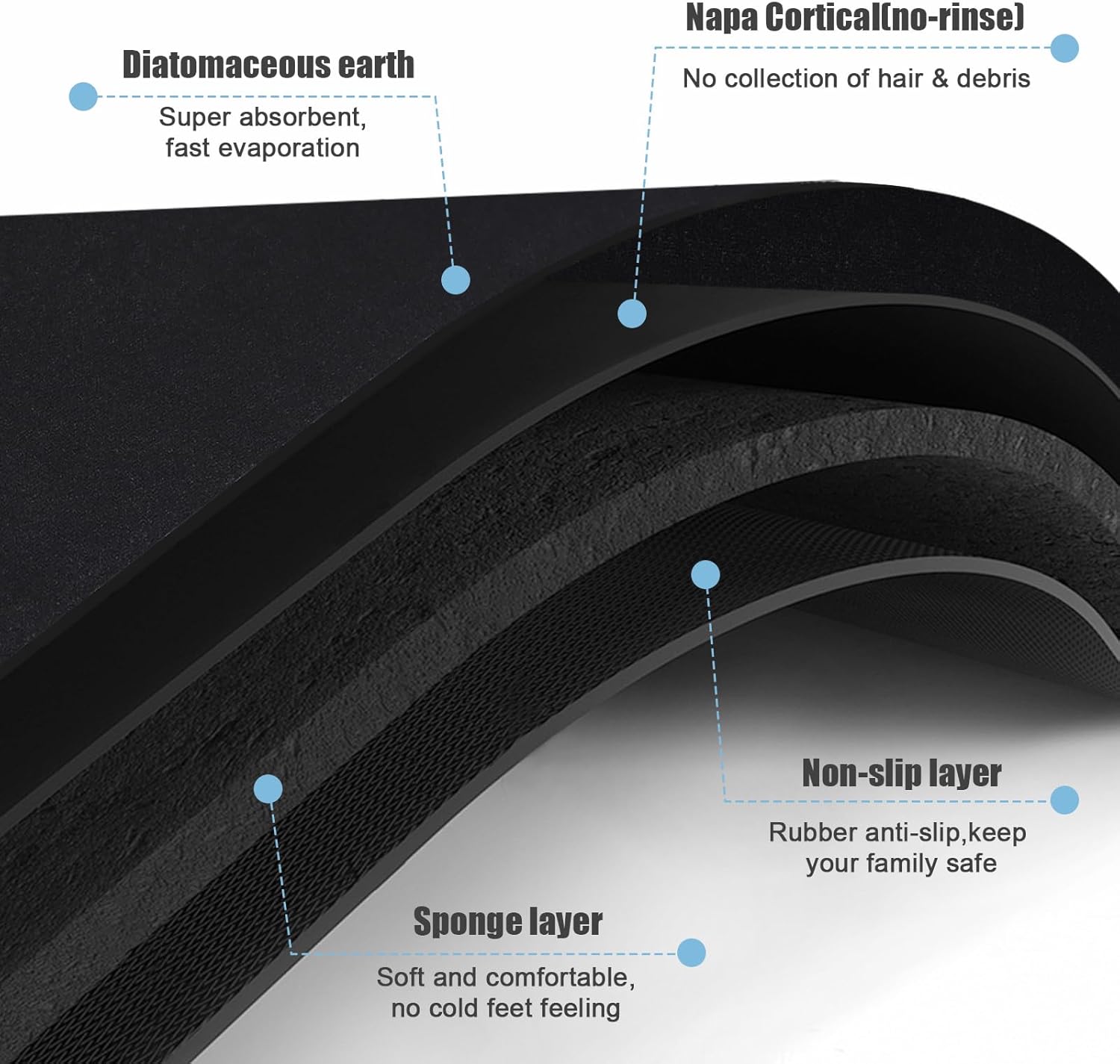 Diatomaceous Earth Bath mat Bathroom Rugs Super Absorbent Quick Dry Non Slip Bath Mat Thin Bathroom Floor Mats Fit Under Door-Shower Rug for in Front of Bathtub Shower, Black, 19.6"x31.5"