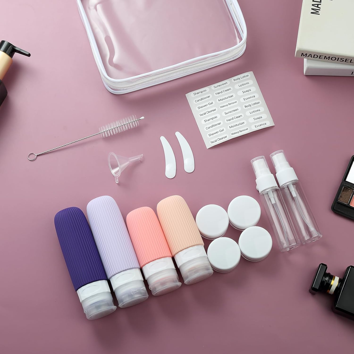 - Useful Travel Accessories: This is a nice assortment of travel containers in a useful zip case. ( Come in 4 Travel Bottles+4 Travel Jars+2 Spray Bottles+2 Scoopers+1 Funnel+1 Clean Brush + 1 Page Label + 1 Clear Toiletry Bag ) Multiple ones allow you take along different beauty products and toiletries according to your requirement