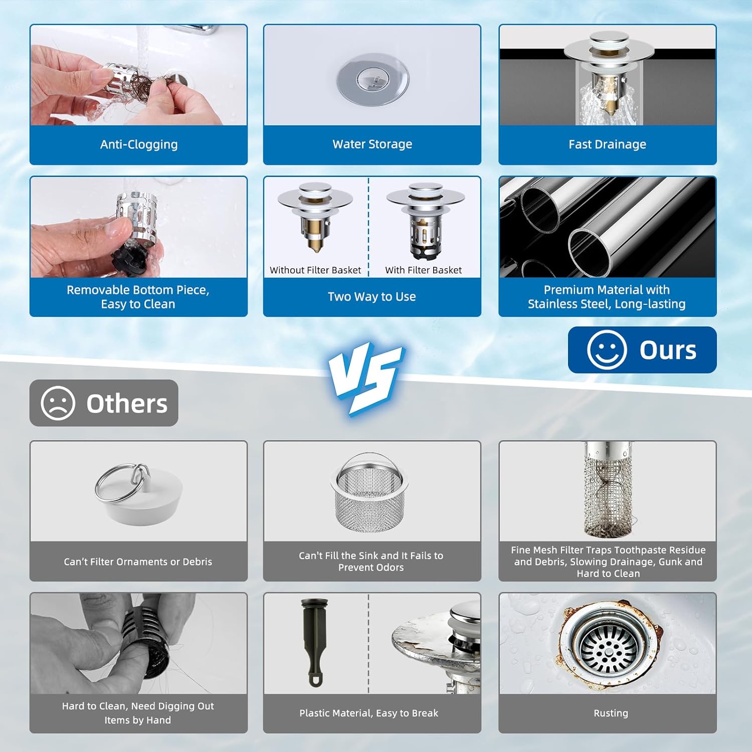- [Pop-up Design] Our pop-up sink drain strainer is made of high-quality stainless steel, plastic, and solid brass, providing exceptional rebound strength, corrosion resistance, and long-lasting durability. It features a long-lasting and sensitive pop-up brass bullet core mechanism, allowing you to easily switch between the water storage and fast drainage modes with just a gentle press