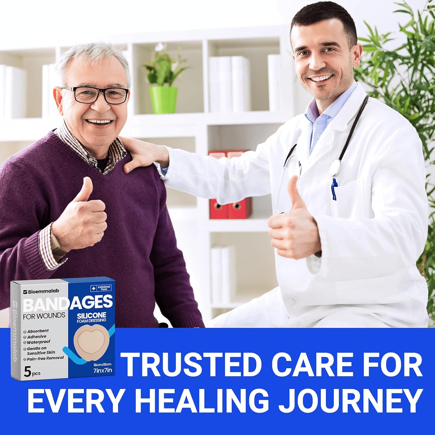 Large Waterproof Bandages 7X7 Silicone Foam Dressing for Sensitive Skin Wound Care, Adhesive Cohesive Pad with Border for First Aid, Post Surgical and Burn, Pressure, Scar Healing (5 PCS)