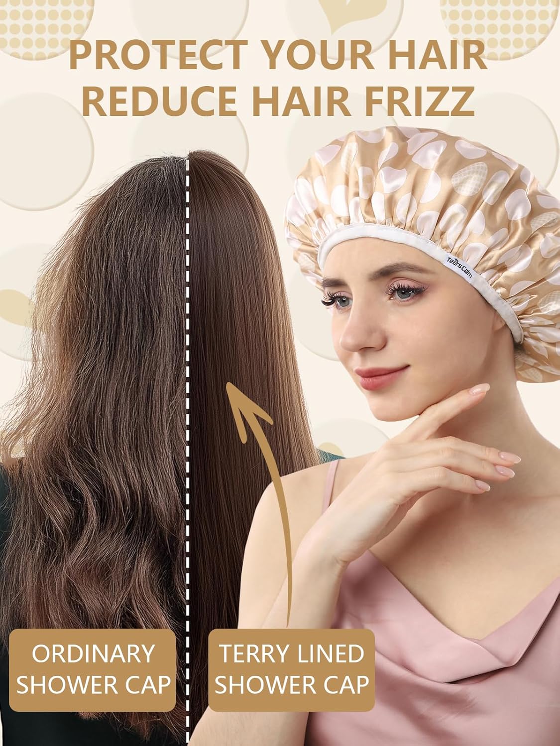 Years calm Terry Lined Shower Cap, Triple Layer Heart Motifs,Waterproof Reusable Elastic,Hair Shower Cap for Women,Terry Cloth Shower Caps for Spa,Clean,Trave (Beige, One Size)