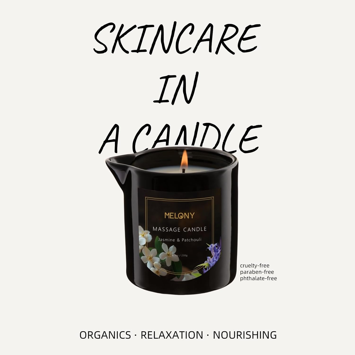 MELONY Luxury Massage Candle - Moisturising, Body Oil Candles for Muscle Relaxation, Home Spa, 8.1OZ (Jasmine & Patchouli)