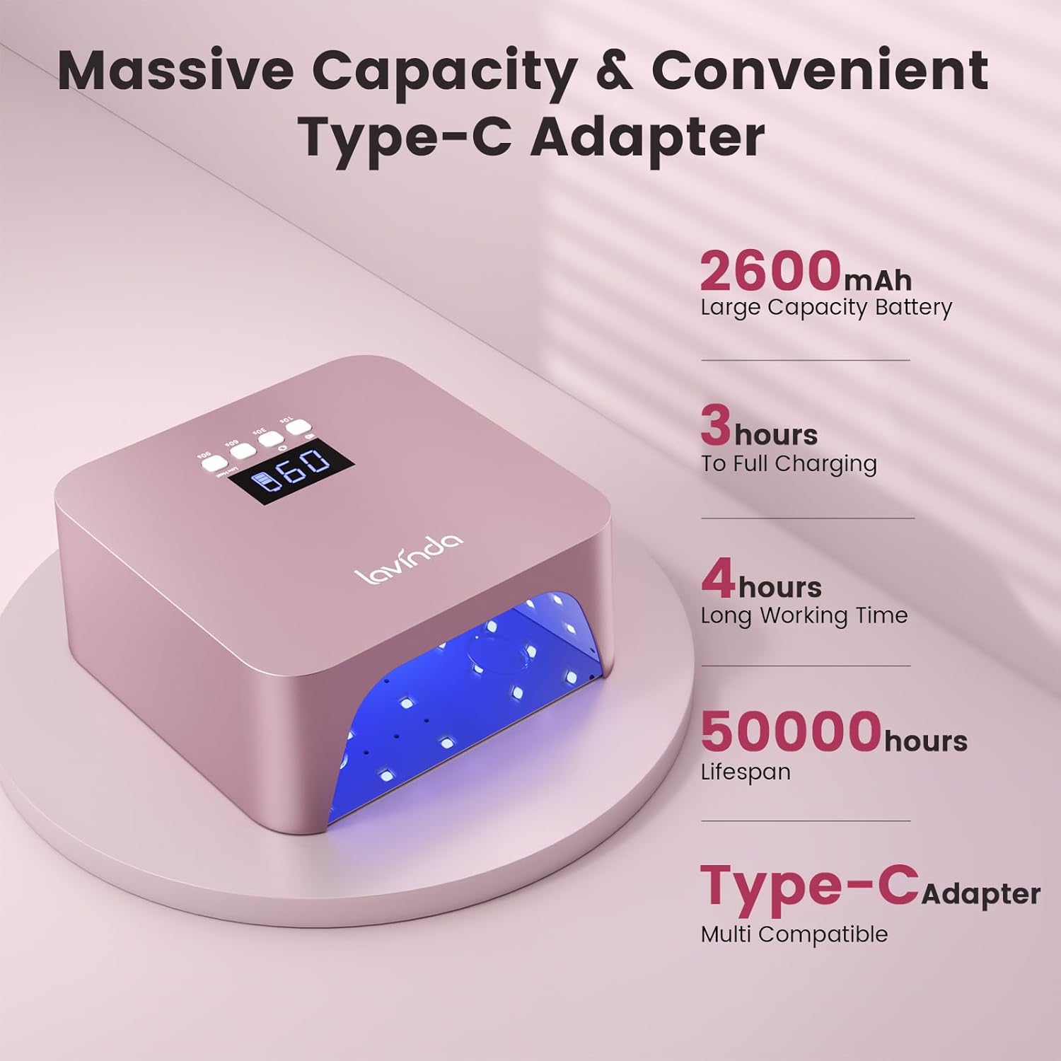 - 【Rotating Display & 2600mAh Battery】 This gel nail lamp features a digital LCD screen with 4 timer modes: 10s/30s/60s/90s. Long-press (1.5s) to seamlessly switch between low heat, mute, and screen rotation—all clearly shown on the display. Powered by a 2600mAh rechargeable battery, it delivers 3–4 hours of cordless runtime and fully charges in just 3 hours. Designed for efficiency in both salon and home use.