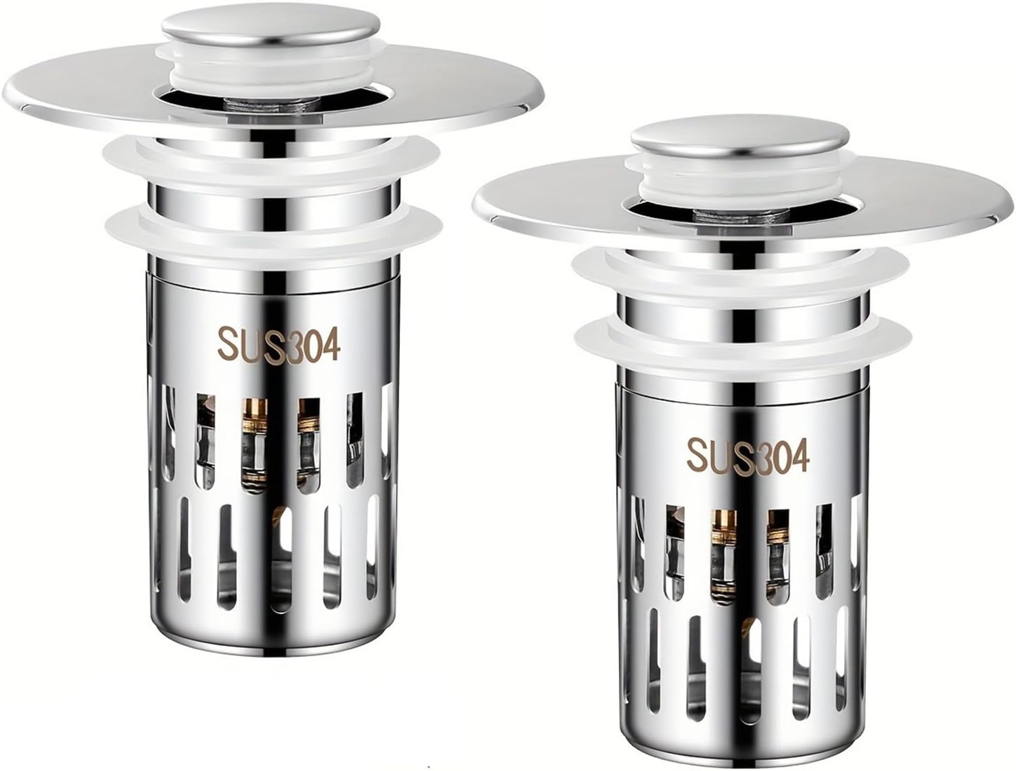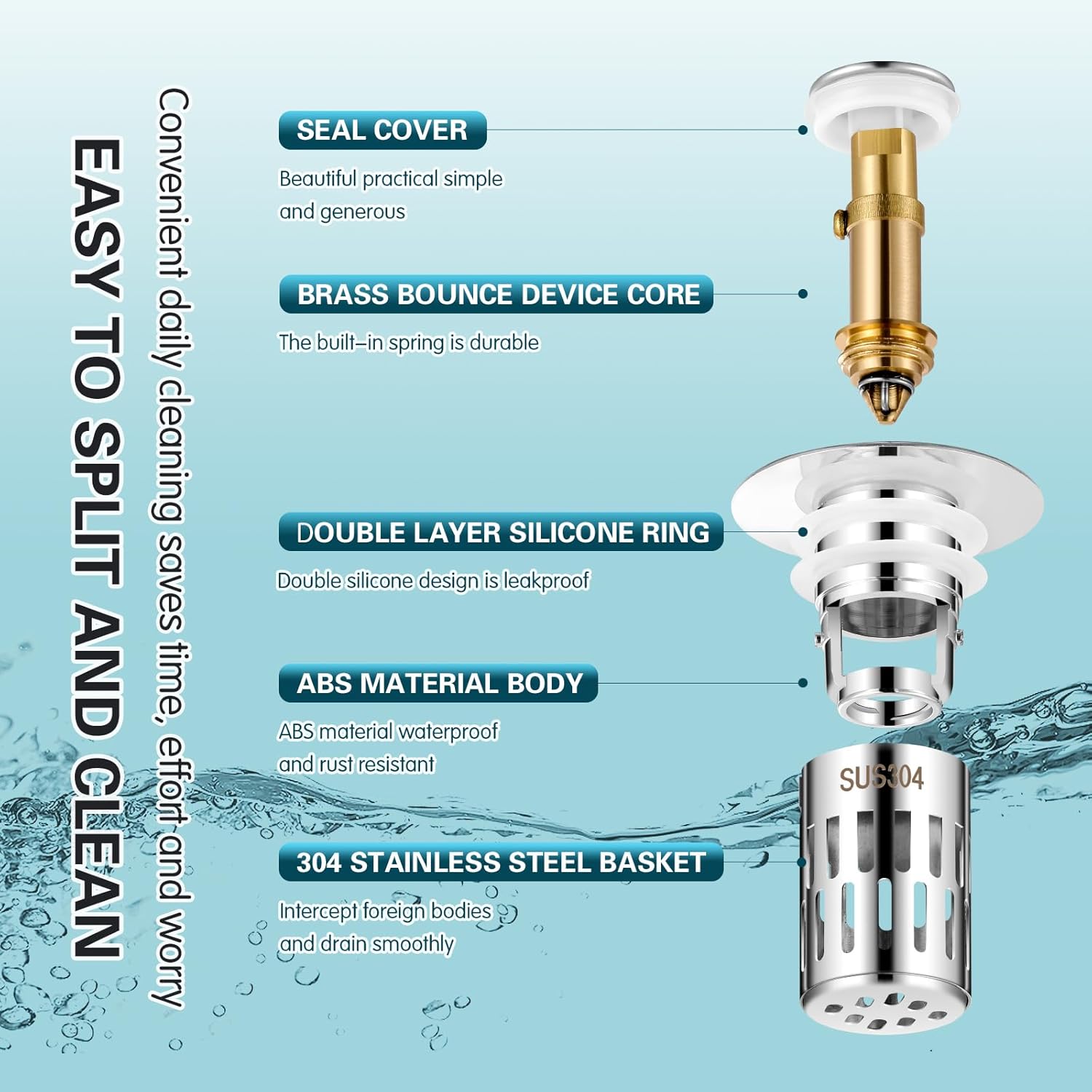 - Effective Hair and Debris Filtering: The Sink Stopper Bathroom Drain with an Anti-Blocking Basket Strainer Inside, Get Rid of The Annoying Tools for Cleaning Clogged Pipes! The Bathroom Sink Strainer Can Effectively Catch The Hair and at The Same Time Allow It To Drain Quickly. Enjoy a cleaner, clog-free sink without the need for harsh chemicals or complicated tools.