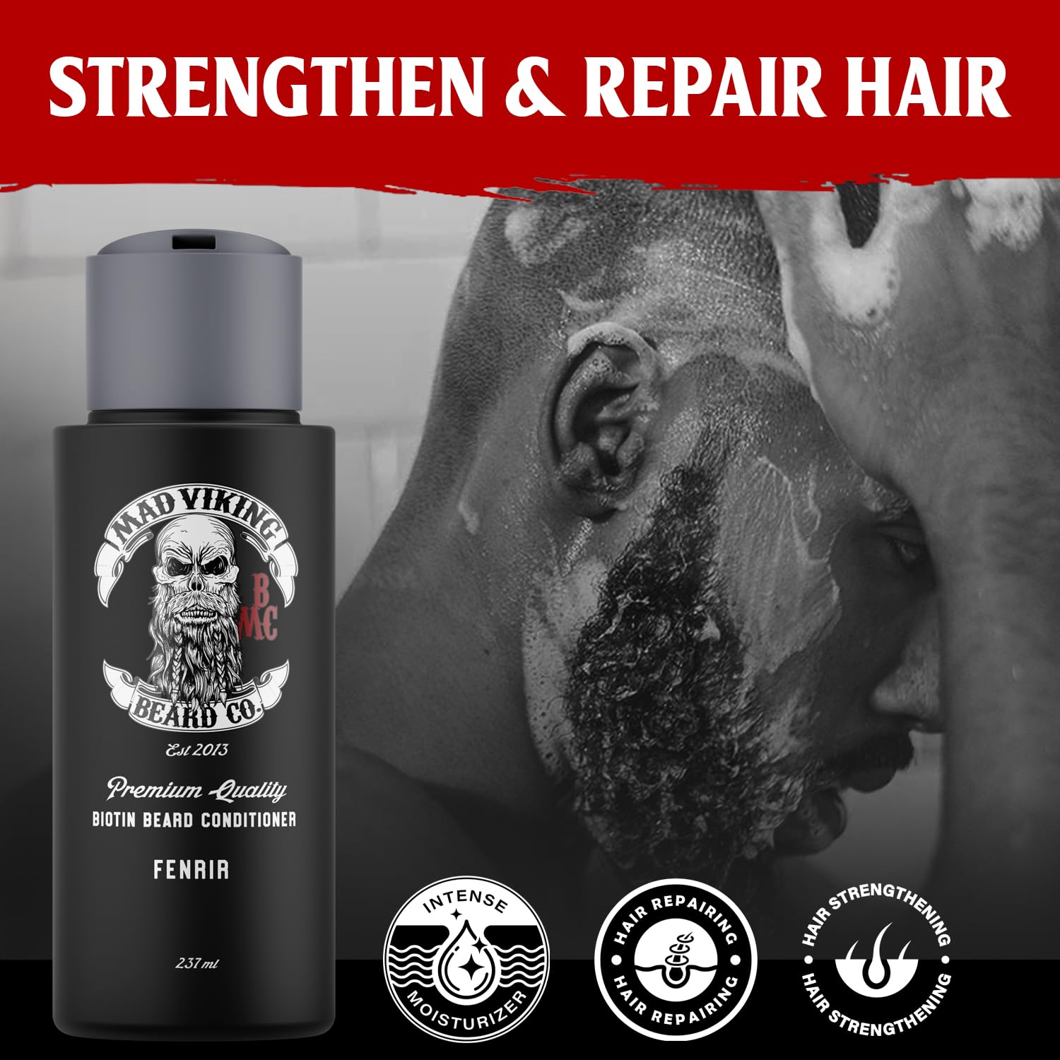 - Addresses Frizz & Tangles – Get rid of frizz with the Fenrir Biotin Beard Conditioner. Packed with Biotin, Provitamin B5, and Organic Korean Ginseng, this conditioner smoothes and strengthens your beard, taming unruly hairs. Olive, Jojoba, and Abyssinian Oils hydrate and soften, while Rice Protein adds fullness and shine. Suitable for anyone battling frizz, this formula leaves your beard looking smooth, healthy, and well-groomed every day. Pair with our Fenrir Biotin Beard Wash for best results!