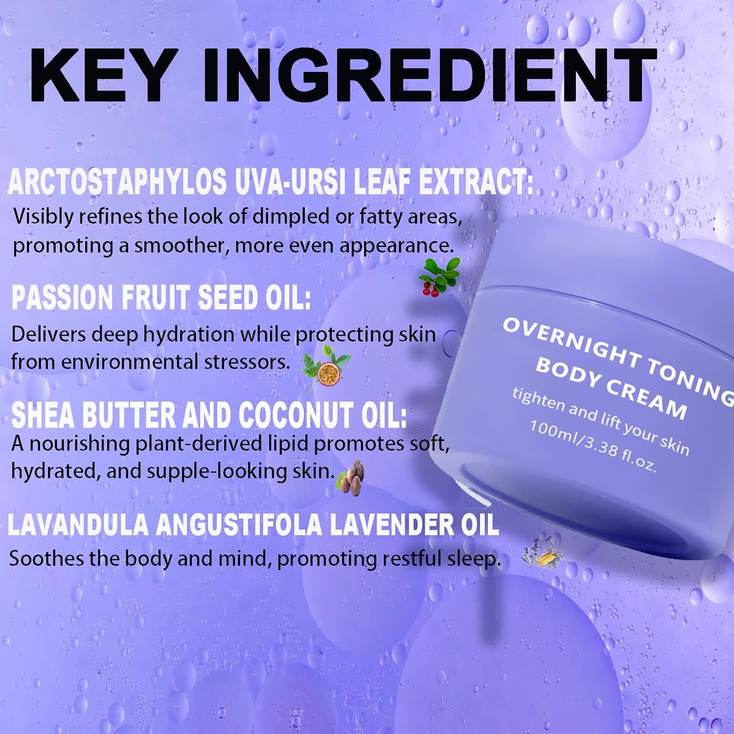 - Overnight Toning Body firming cream: Deeply nourishes and moisturizes to leave skin soft, smooth, and supple. Suitable for both day and night use—just apply a small amount to clean skin and gently massage until fully absorbed.