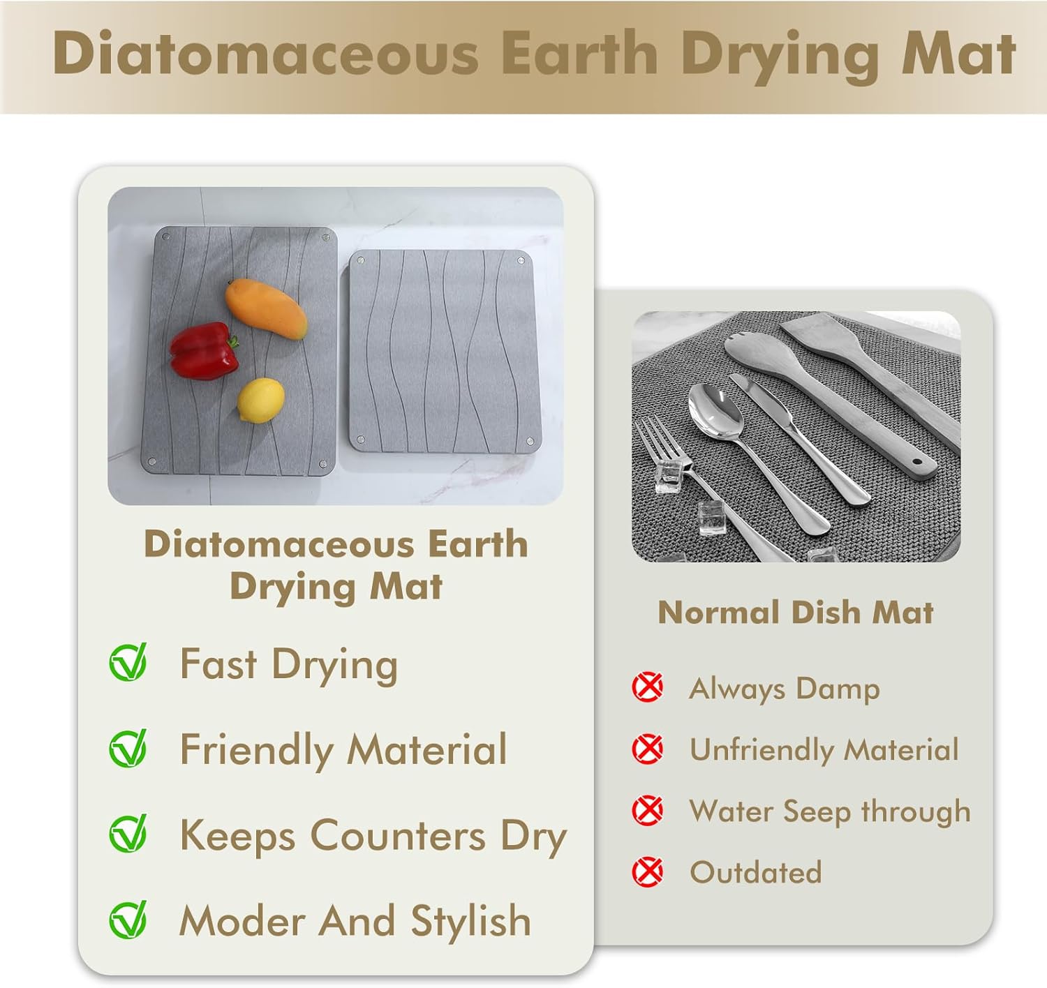- Premium Material:The 2 nesting drying mat is crafted from natural diatomaceous earth, features stainless steel feet. Renowned for its unique porous structure and low density, diatomaceous earth delivers exceptional water absorption. As a kitchen or bathroom counter drying solution, it rapidly absorbs water droplets from dishes and utensils,effectively preventing moisture buildup while promoting hygiene.