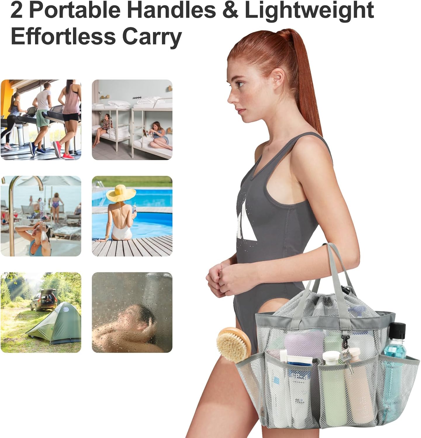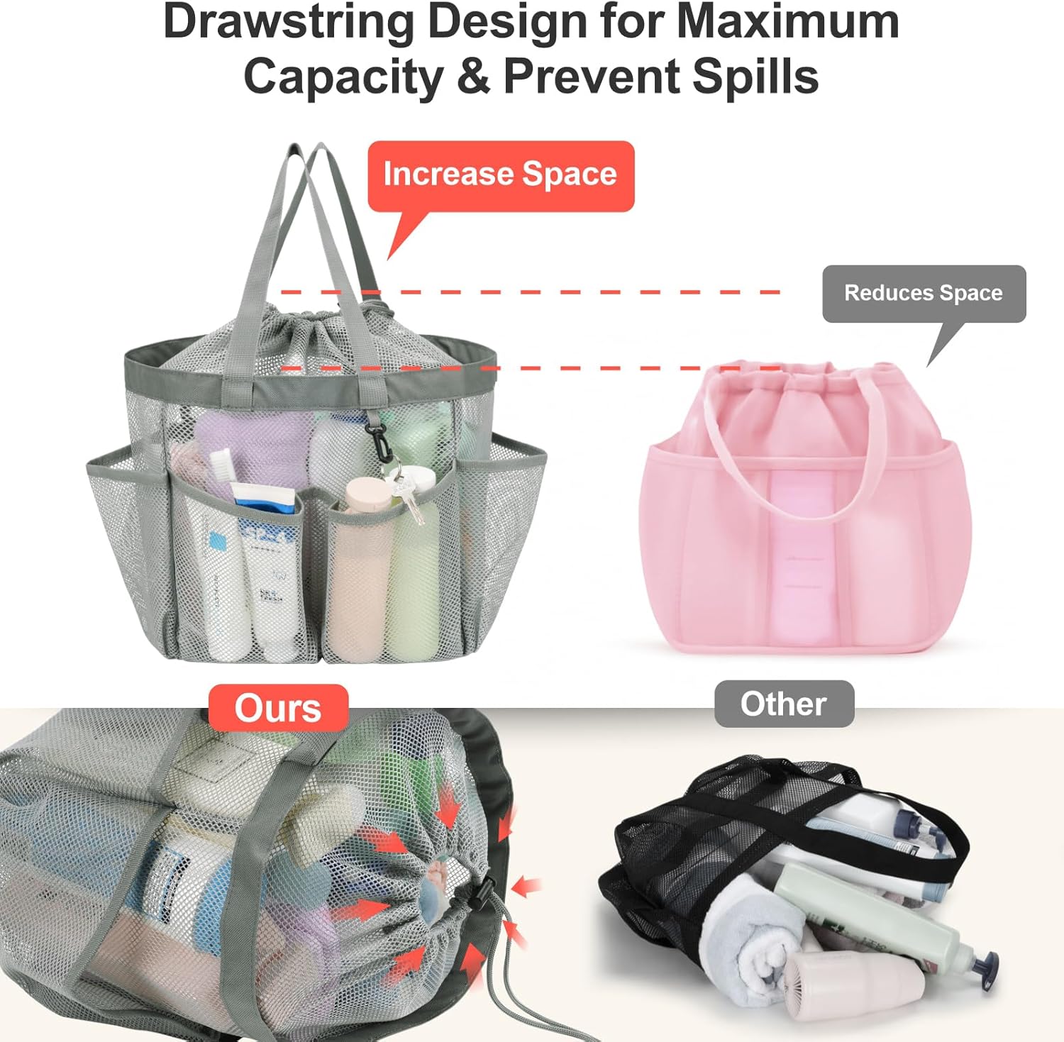 - 7 Upgraded Deep Pockets & Secure Drawstring for Peace of Mind: This shower tote bag features 7 upgraded exterior pockets with 7-inch depth, keeping tall bottles upright to prevent spills. A secure drawstring closure ensures toiletries stay safely inside—no more spills or lost items while you’re on the move