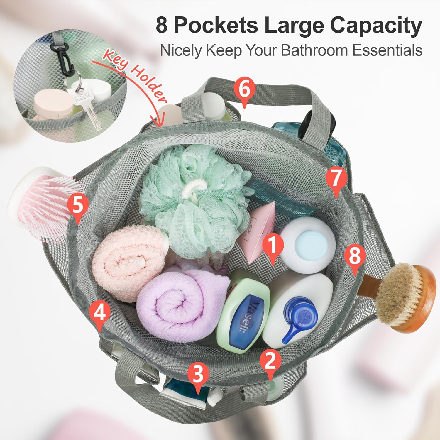 - Spacious & Organized for All Bathroom Essentials: Never worry about running out of room with our extra-large shower caddy dorm measuring 10.2" x 7.9" x 10.6". 7 exterior pockets and a roomy main compartment fit all your essentials like shampoo, conditioner, body wash, lotion, soap, toothbrush, towels, and more; Includes a handy keychain so you’ll always know where your keys are