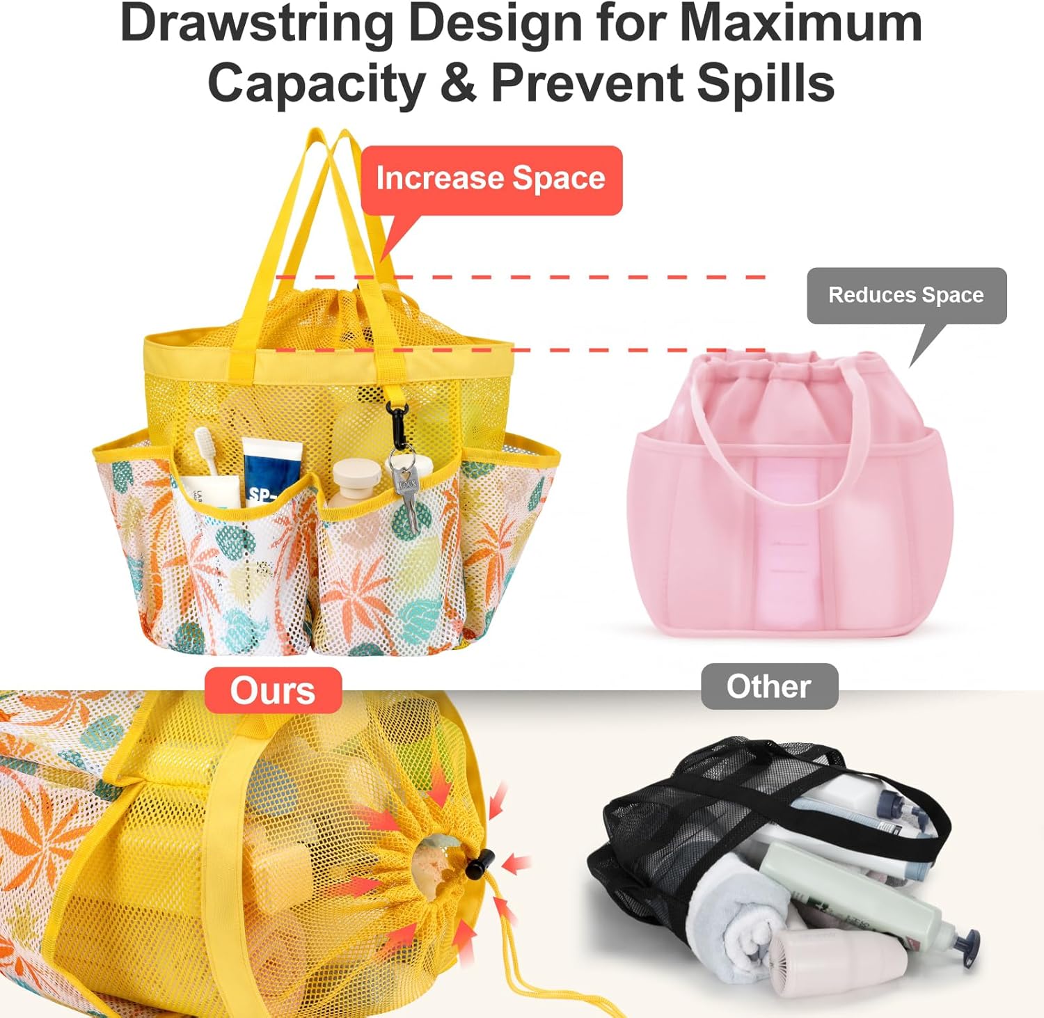 - 7 Upgraded Deep Pockets & Secure Drawstring for Peace of Mind: This shower tote bag features 7 upgraded exterior pockets with 7-inch depth, keeping tall bottles upright to prevent spills. A secure drawstring closure ensures toiletries stay safely inside—no more spills or lost items while you’re on the move