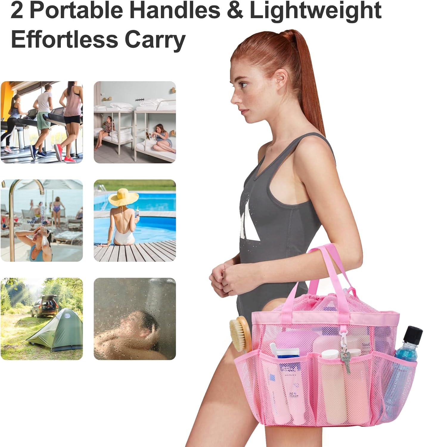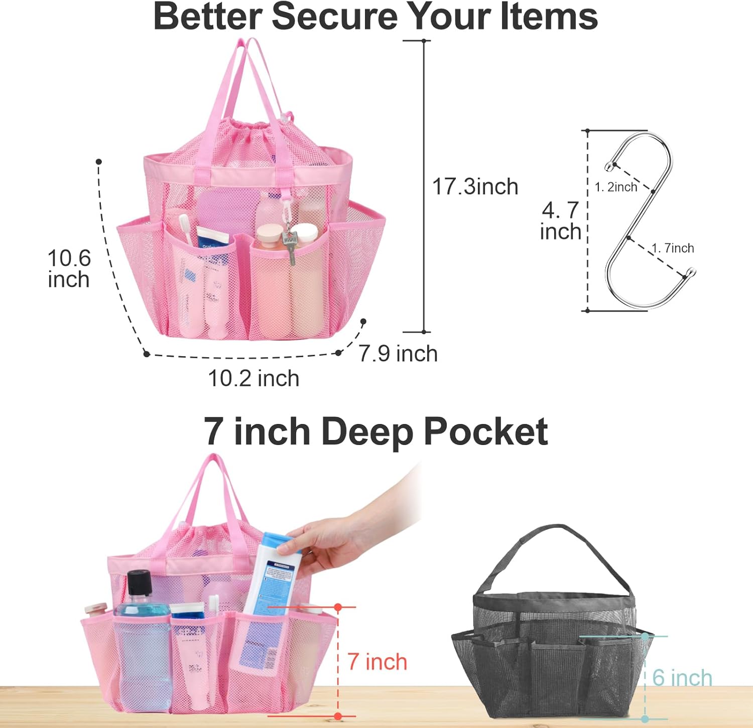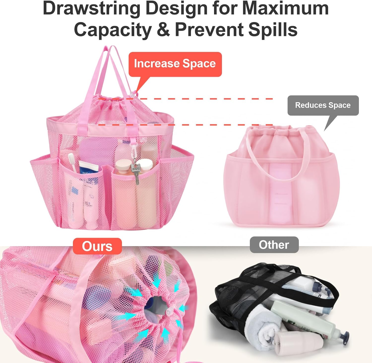 - 7 Upgraded Deep Pockets & Secure Drawstring for Peace of Mind: This shower tote bag features 7 upgraded exterior pockets with 7-inch depth, keeping tall bottles upright to prevent spills. A secure drawstring closure ensures toiletries stay safely inside—no more spills or lost items while you’re on the move