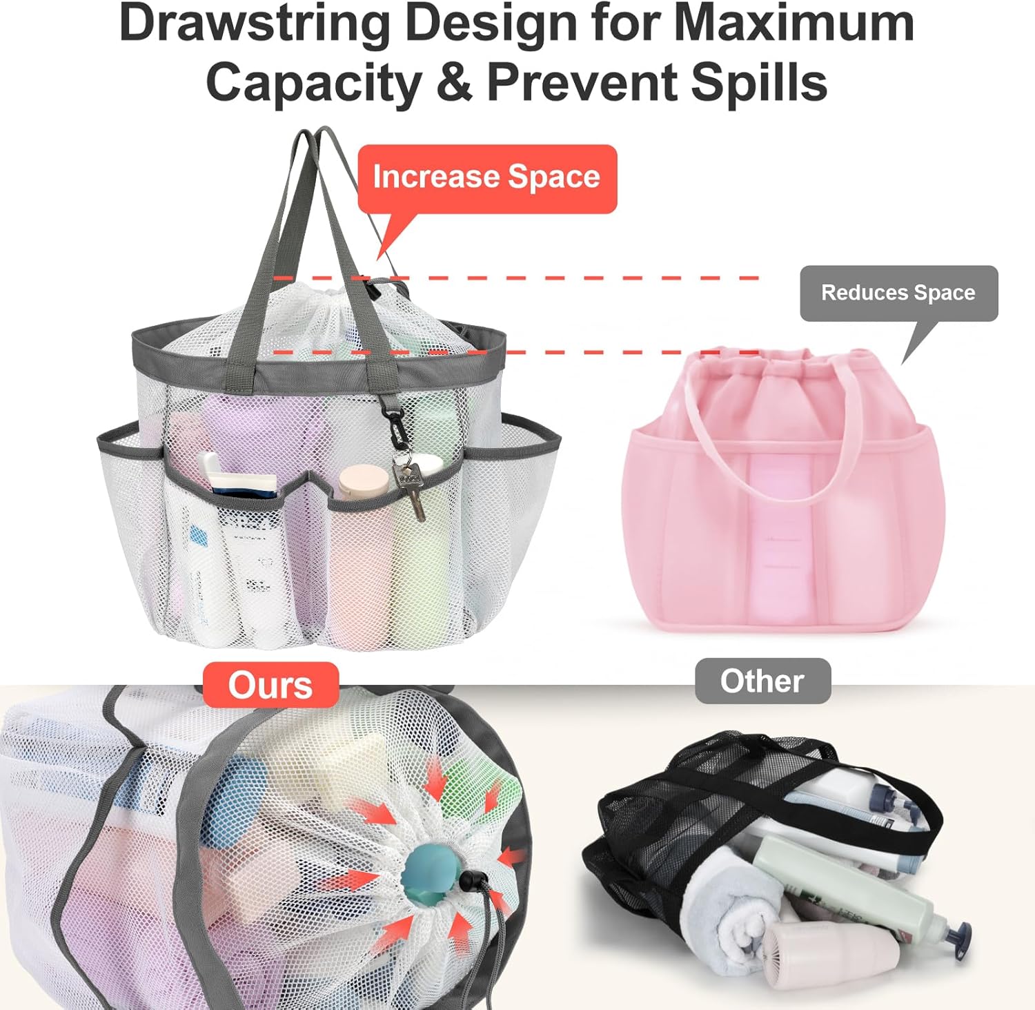 - 7 Upgraded Deep Pockets & Secure Drawstring for Peace of Mind: This shower tote bag features 7 upgraded exterior pockets with 7-inch depth, keeping tall bottles upright to prevent spills. A secure drawstring closure ensures toiletries stay safely inside—no more spills or lost items while you’re on the move