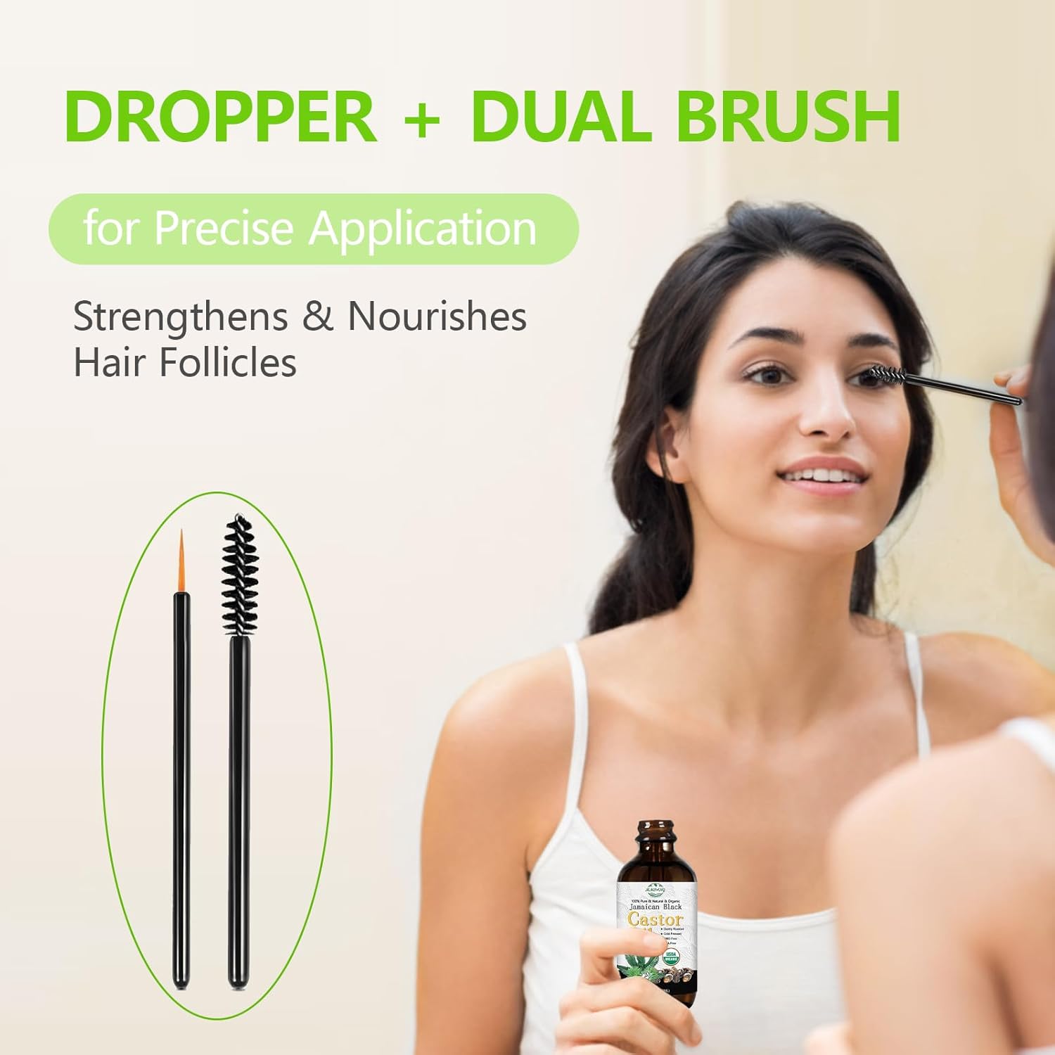 USDA Organic Jamaican Black Castor Oil - 100% Pure, Cold Pressed, Hexane-Free & Vegan, 2oz Brown Glass Bottle w/Dropper & Dual Brush for Hair Growth, Thicker Eyelashes, Brows & Scalp Care