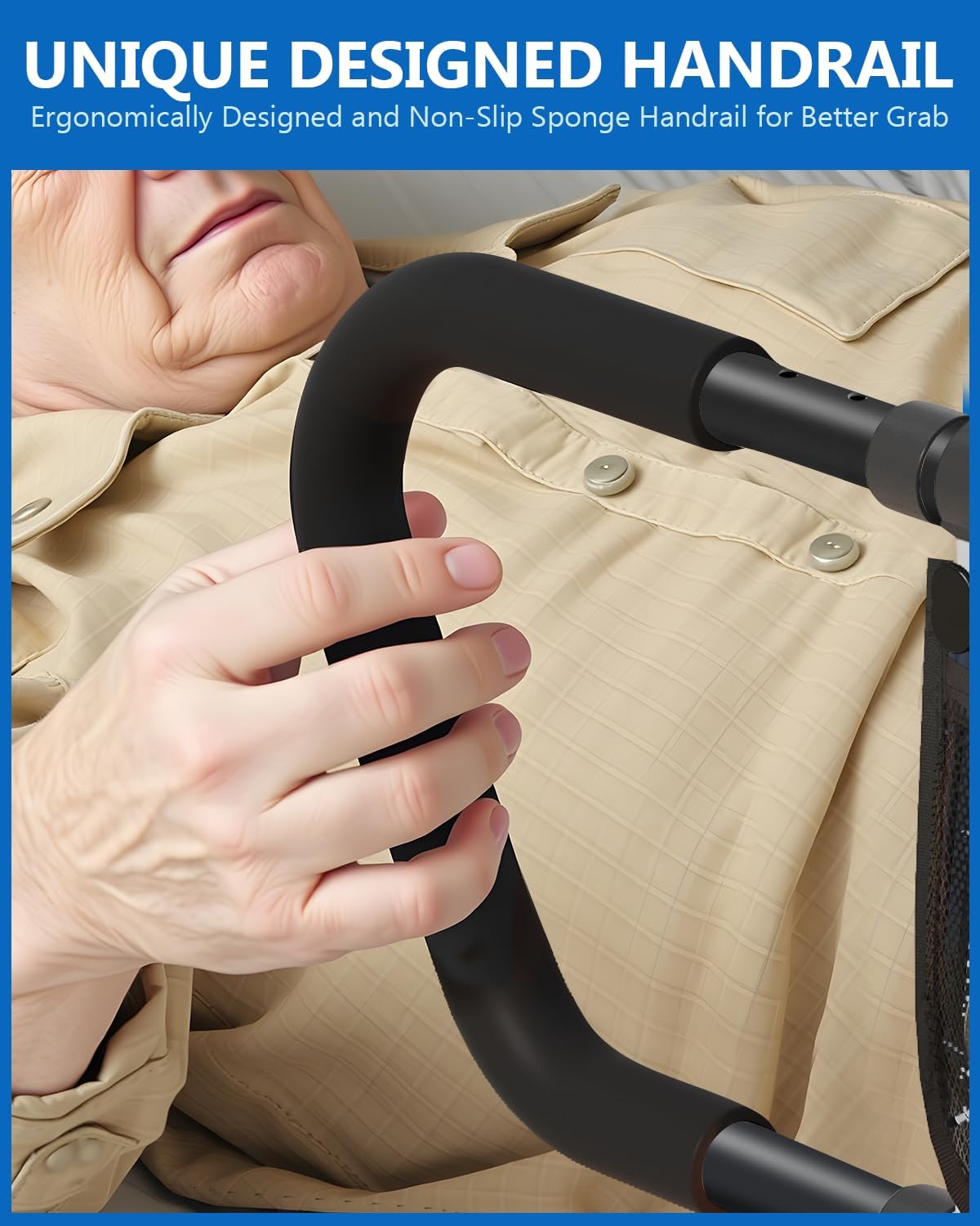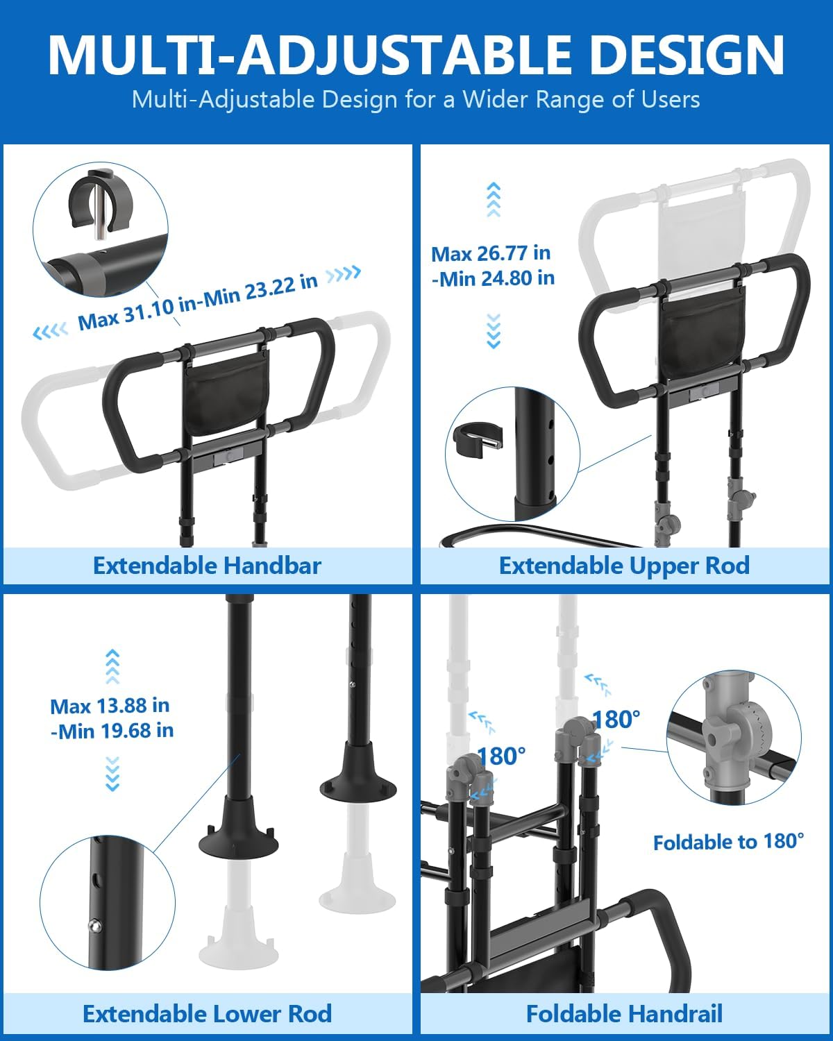 - Fully Adjustable Design: Telescoping handbar (23.22"–31.10") and rods (upper 24.80"–26.77", lower 13.88"–19.68") fit most bed sizes. Foldable 180° handrail for easy storage and transport.