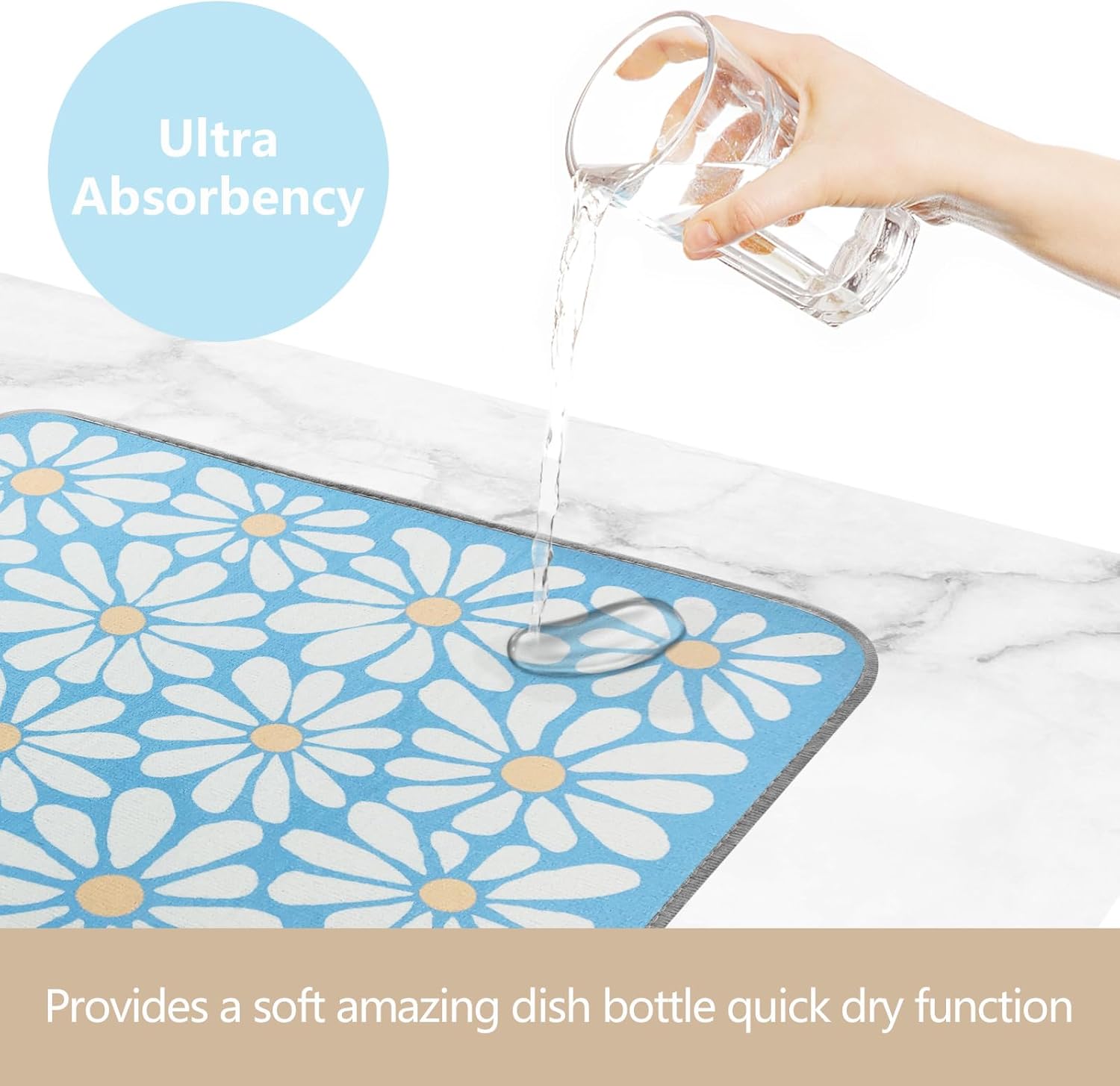 SHIYUE Dish Drying Mat for Kitchen Counter Super Absorbent Spring Kitchen Decor Microfiber Drying Matainers Rack Fast Pad Dish Drainer Mats(Sky Blue Flower,16''x18'')