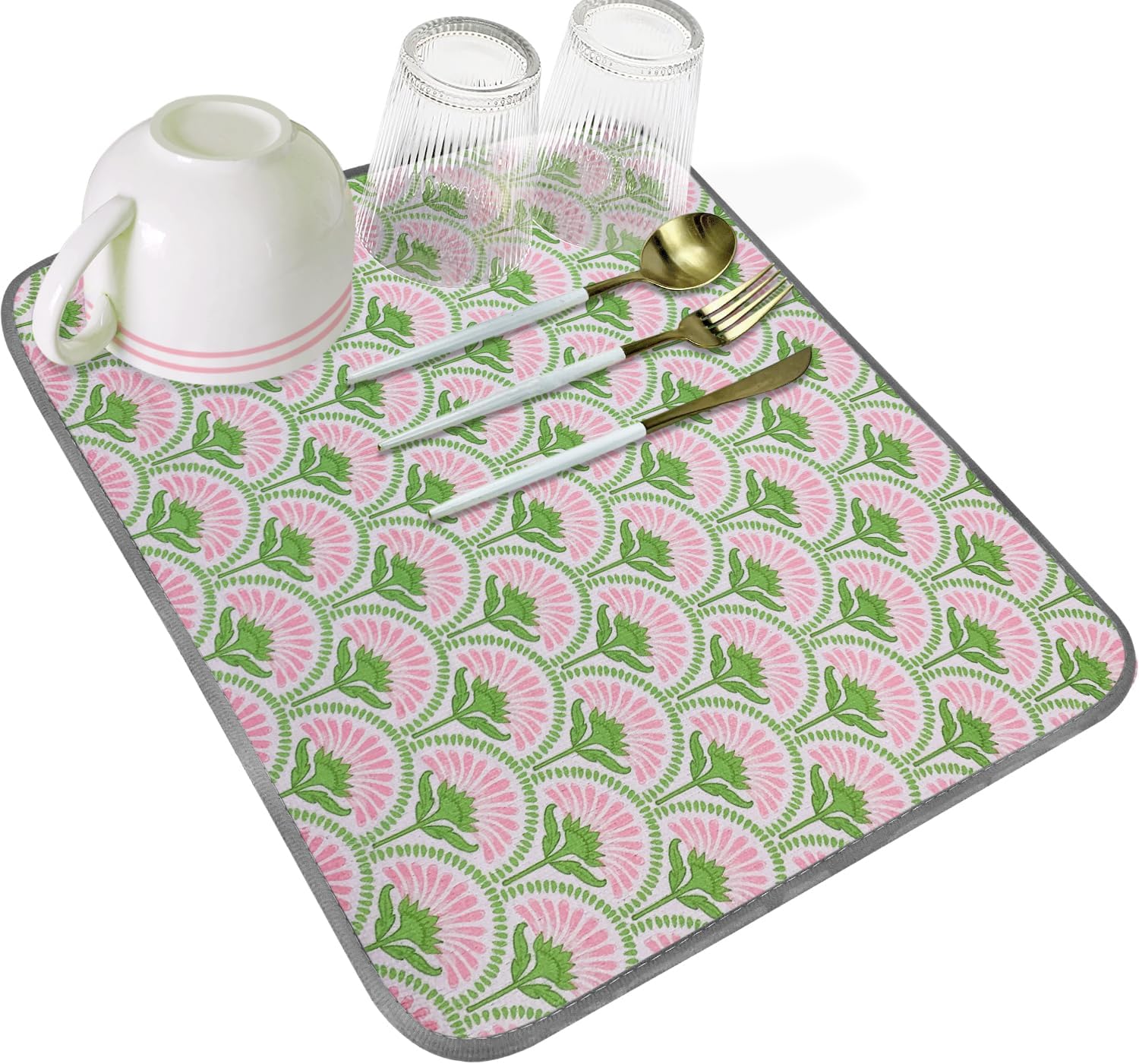 SHIYUE Dish Drying Mat for Kitchen Counter Super Absorbent Spring Kitchen Decor Microfiber Drying Matainers Rack Fast Pad Dish Drainer Mats(Bohe Flower,16''x18'')