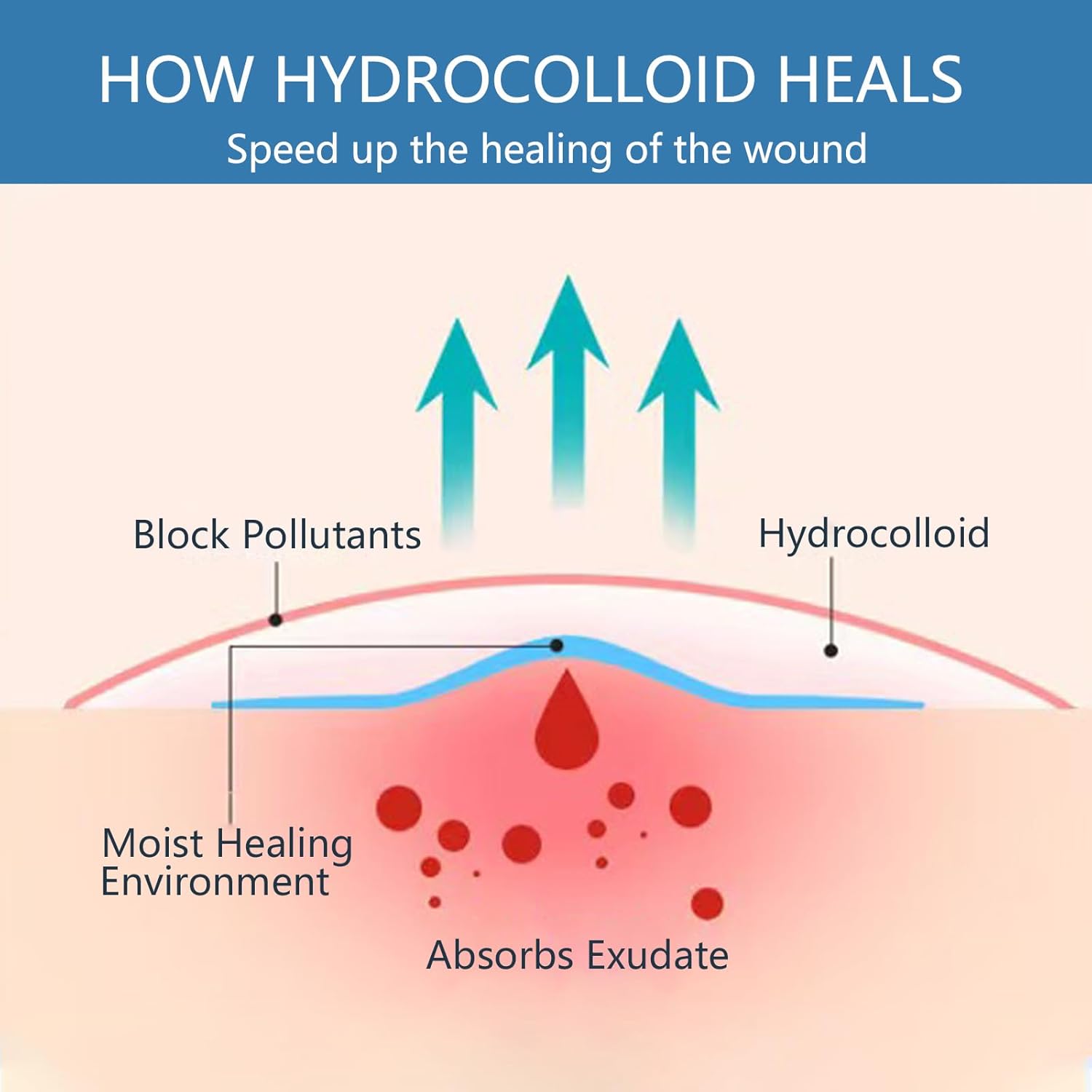 - Protective - Medical grade hydrocolloid pads protect the injured area, wick away excess moisture and impurities, reduce redness, keep it clean and promotes healing