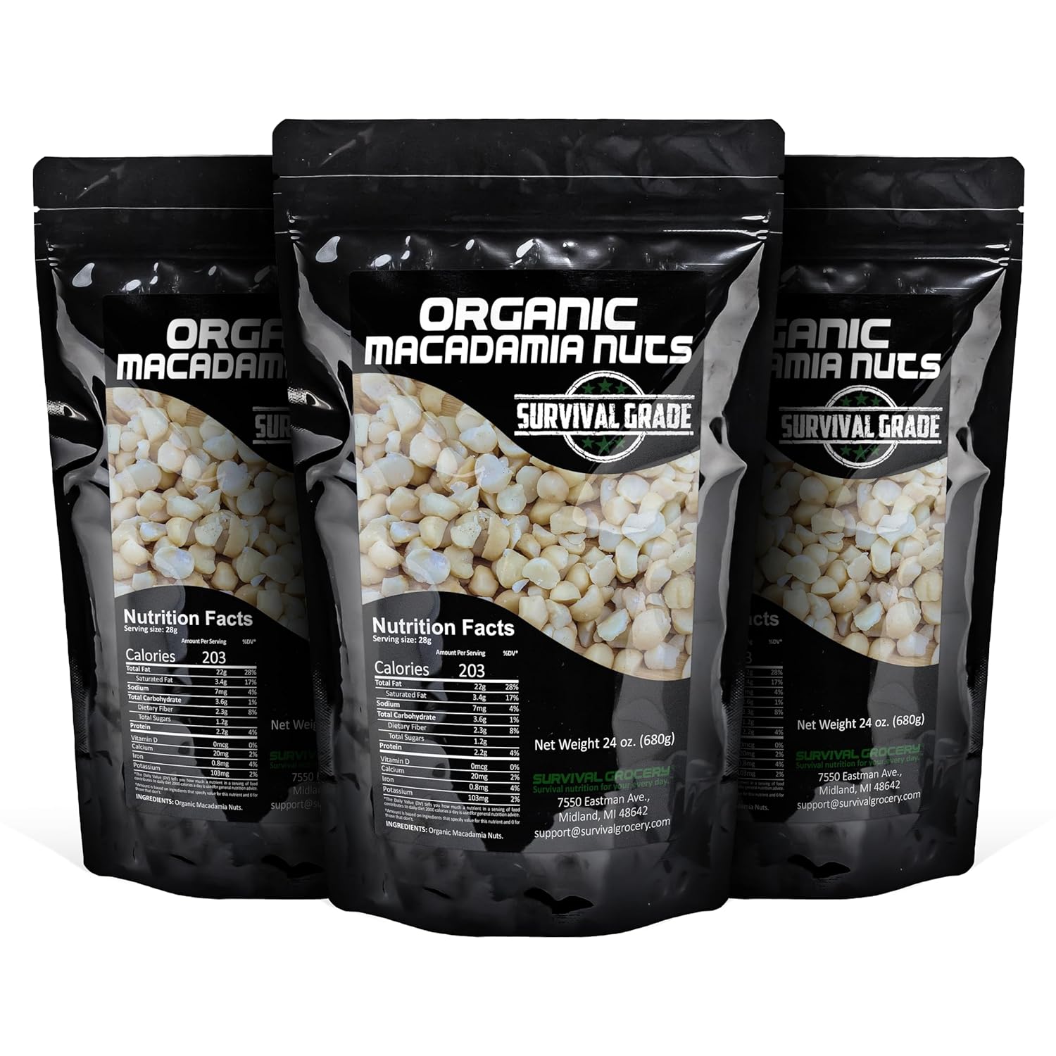 Survival Grocery® Organic Macadamia Nuts – Keto-Friendly Healthy Fats & Plant Protein, Oxygen- & Light-Barrier Packaging + O₂ & Moisture Packs, (Single or Multi-Pack Savings) (72 oz./3 Bags)