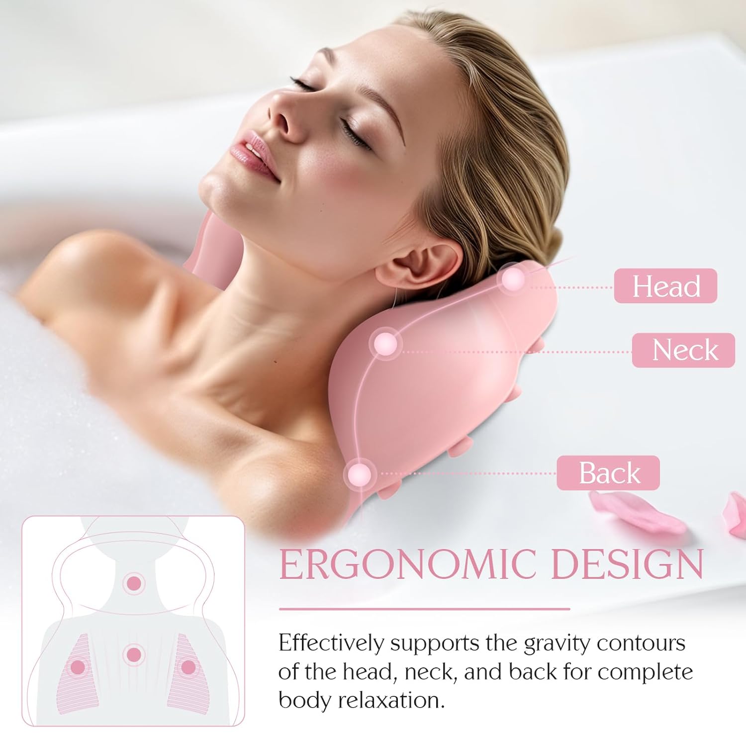 Silicone Bath Pillow, New Material Bath Pillows for Tub Head Neck and Back Support, Bath Tub Pillow with 4D Press Inflatable Airbag and Non-Slip Strong Suction Cups, Quick-Drying, Easy to Store, Pink