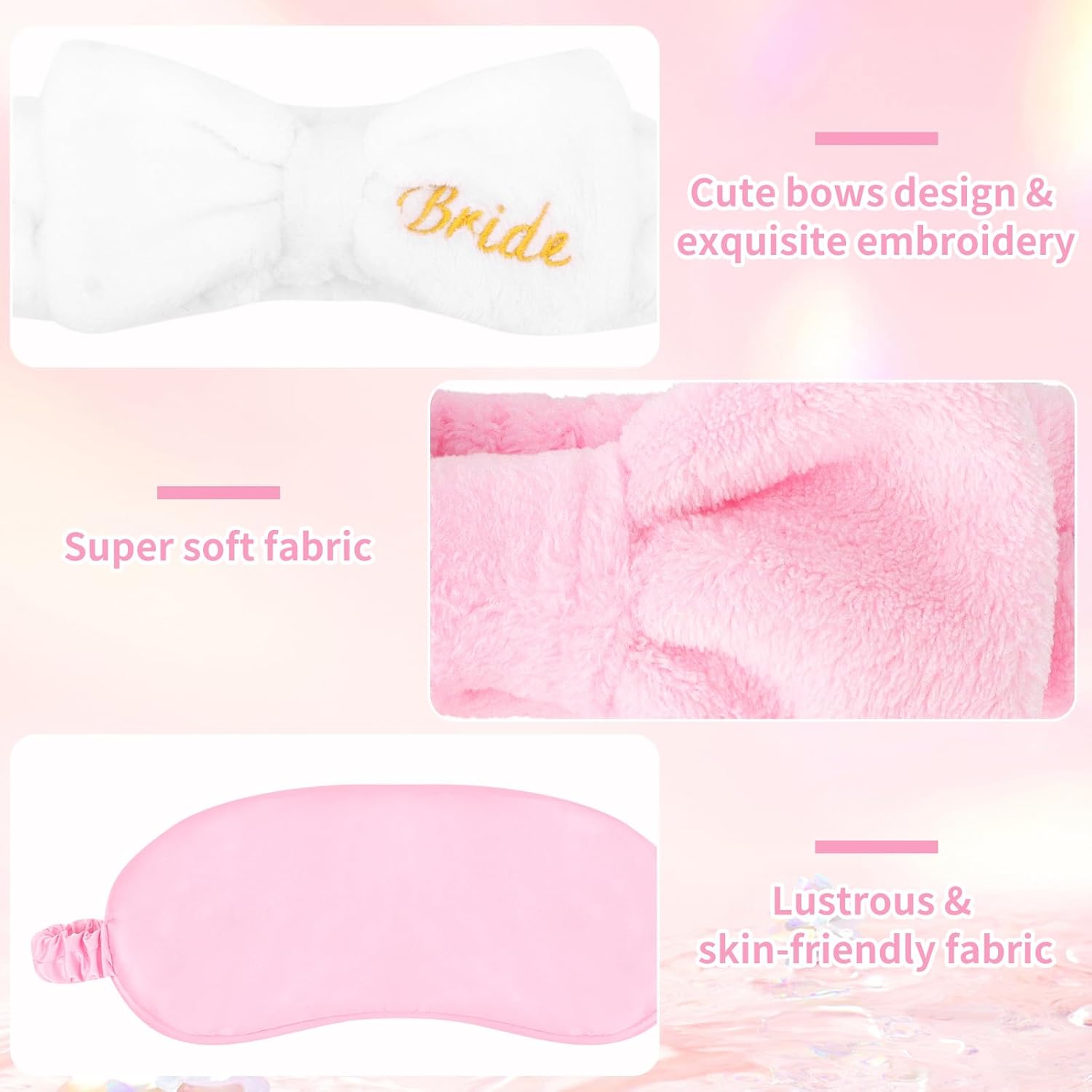 - Coordinated Design (Headbands + Masks Match!): Cute Bow & Consistent Color Matching: The “Bride” headband stands out with gold embroidery, while bow headbands add a cohesive look. Eye masks feature the same color tone—great for bridesmaid hair accessories and matching party vibes.